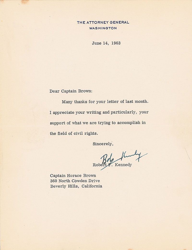 TLS signed “Bob Kennedy,” one page, 7 x 9, Attorney General letterhead, June 14, 1963. Letter to actress Marion Davies’ widower, Captain Horace Brown. In full: “Many thanks for your letter of last month. I appreciate your writing and particularly, your support of what we are trying to accomplish in the field of civil rights.” In fine condition, with a trivial stain to top left.