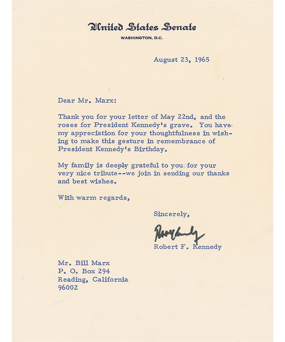 TLS, one page, 6.25 x 8, United States Senate letterhead, August 23, 1965. Kennedy thanks Bill Marx for his gratitude. In full: “Thank you for your letter of May 22nd, and the roses for President Kennedy’s grave. You have my appreciation for your thoughtfulness in wishing to make this gesture in remembrance of President Kennedy’s birthday. My family is deeply grateful to you for your very nice tribute—we join in sending our thanks and best wishes.” In fine condition. Accompanied by the original mailing envelope.