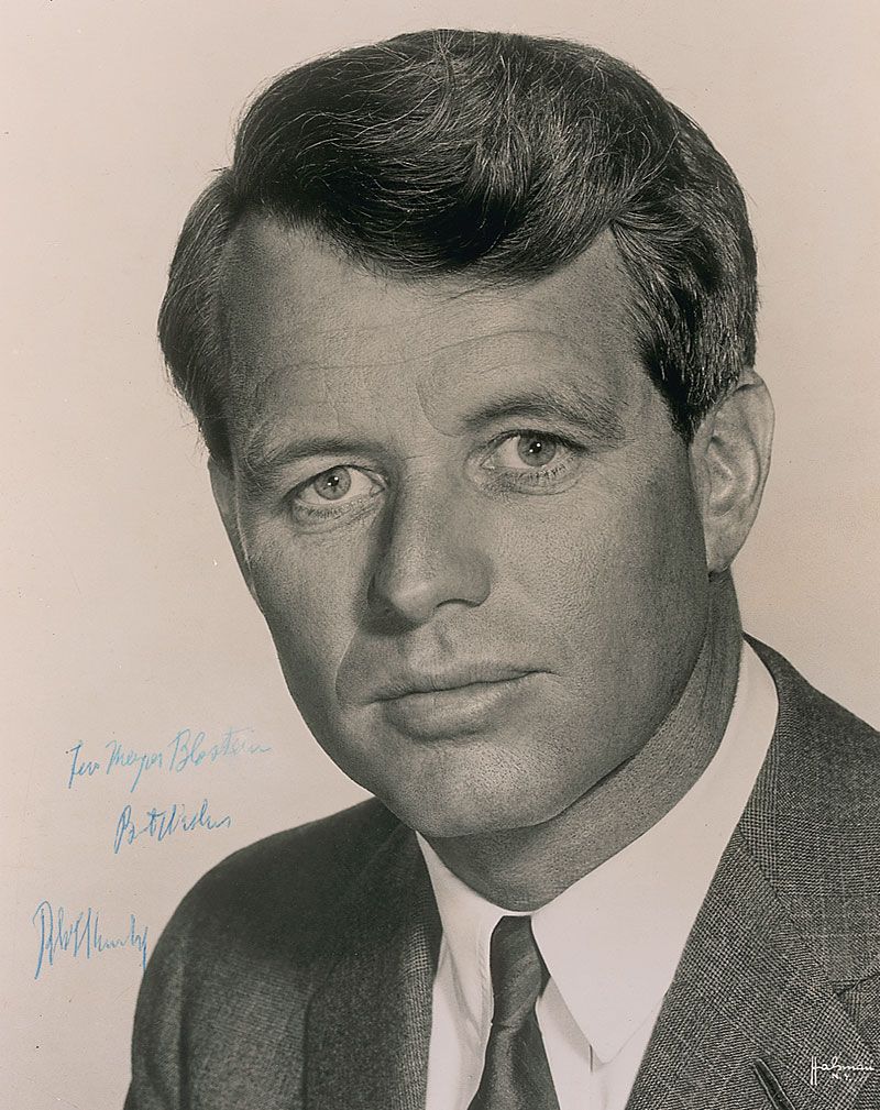 Vintage glossy 6.5 x 8.25 head-and-shoulders photo, signed and inscribed in blue ballpoint, “For Meyer Blostein, best wishes, Robert Kennedy.” In very good condition, with trimmed edges, and scattered creases and surface marks. Accompanied by a full letter of authenticity from PSA/DNA.