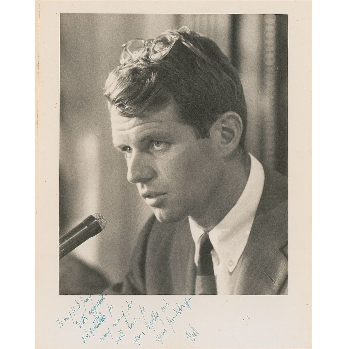 Superb youthful matte-finish 8 x 10 photo of Kennedy while serving on the McClellan Committee, signed and inscribed in the lower border in blue ballpoint, “To my friend James, With appreciation and gratitude for many many jobs well done, for your loyalty and your friendship—Bob.” In fine condition, with a thin stain to upper left edge.