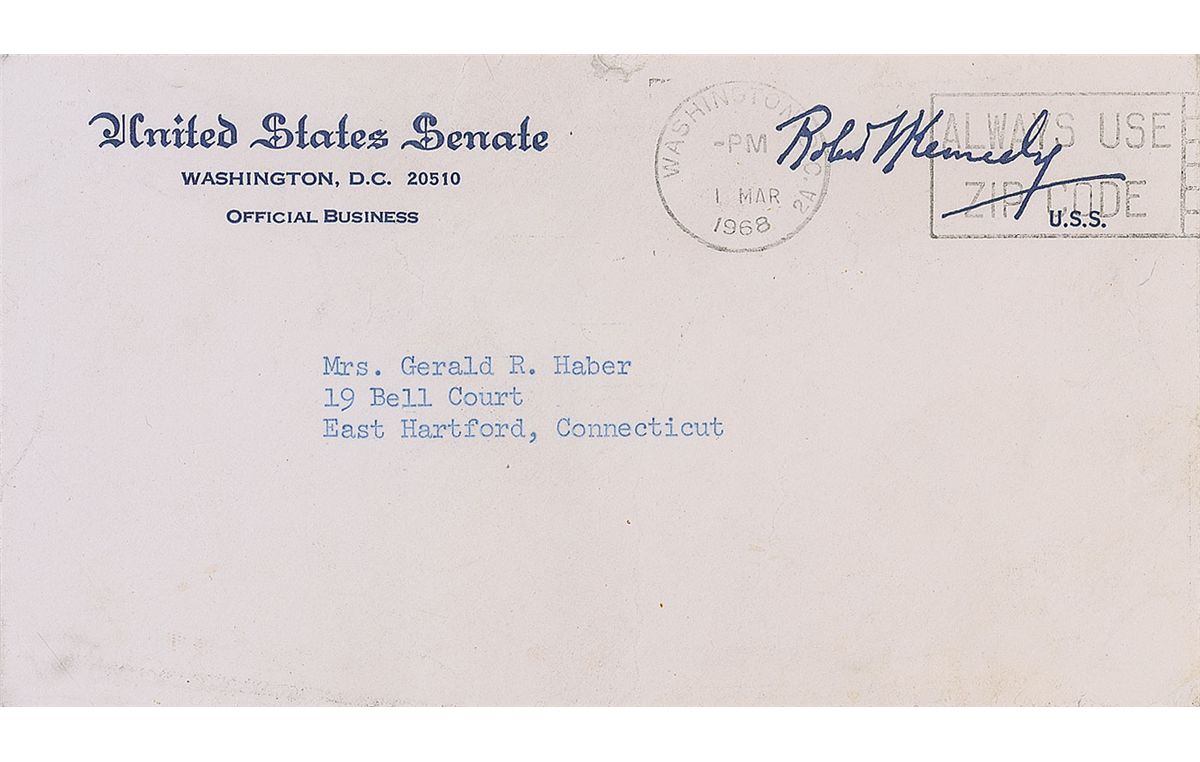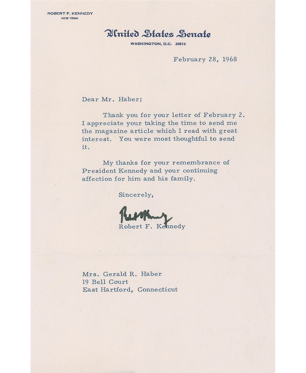 TLS, one page, 6 x 9, United States Senate letterhead, February 28, 1968. Letter to Gerald Haber. In full: “Thank you for your letter of February 2. I appreciate your taking the time to send me the magazine article which I read with great interest. You were most thoughtful to send it. My thanks for your remembrance of President Kennedy and your continuing affection for him and his family.” In fine condition. Accompanied by the original mailing envelope.