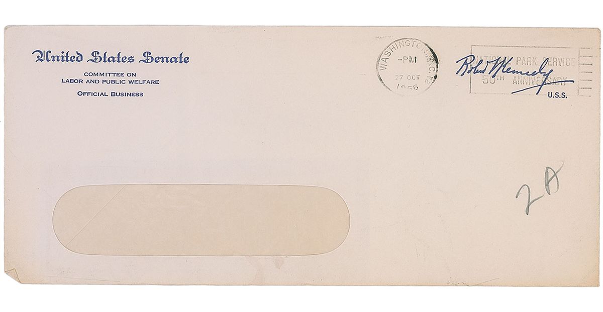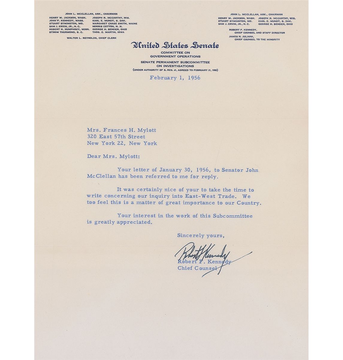 TLS, one page, 8 x 10.5, United States Senate letterhead, February 1, 1956. Letter to Frances H. Mylett. In part: “Your letter of January 30, 1956, to Senator John McClellan has been referred to me for reply. It was certainly nice of your [sic] to take the time to write concerning our inquiry in to East-West Trade. We too feel this is a matter of great importance to our Country.” In fine condition. Accompanied by the original mailing envelope, bearing a pre-printed free frank.