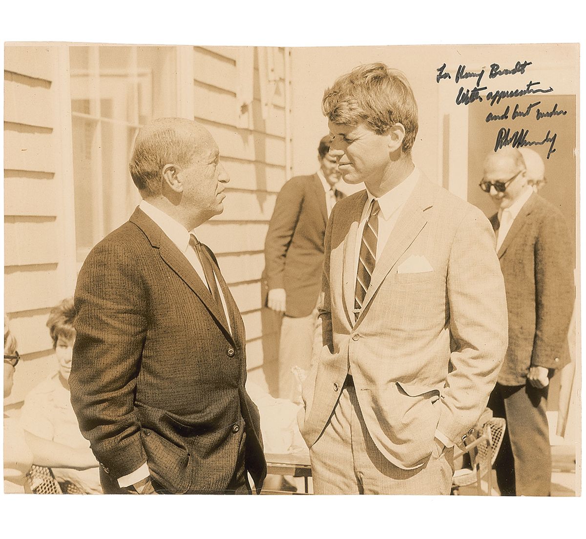 Glossy 9.5 x 7.25 candid photo of Kennedy, signed and inscribed in black felt tip, “For Kenny Bundt, with appreciation and best wishes, Robert F. Kennedy.” In fine condition, with uniformly trimmed edges.