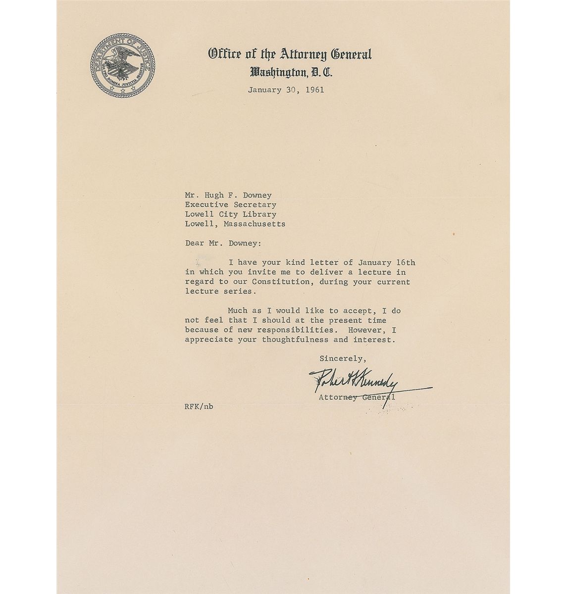 TLS, one page, 8 x 10.5, Office of the Attorney General letterhead, January 30, 1961. Letter to Hugh F. Downey, executive director of the Lowell City Library. In part: “You invite me to deliver a lecture in regard to our Constitution, during your current lecture series. Much as I would like to accept, I do not feel that I should at the present time because of new responsibilities. However, I appreciate your thoughtfulness and interest.” In fine condition. Kennedy was indeed tasked with “new responsibilities,” having been appointed to the position of attorney general just ten days earlier upon his brother’s inauguration as president of the United States.