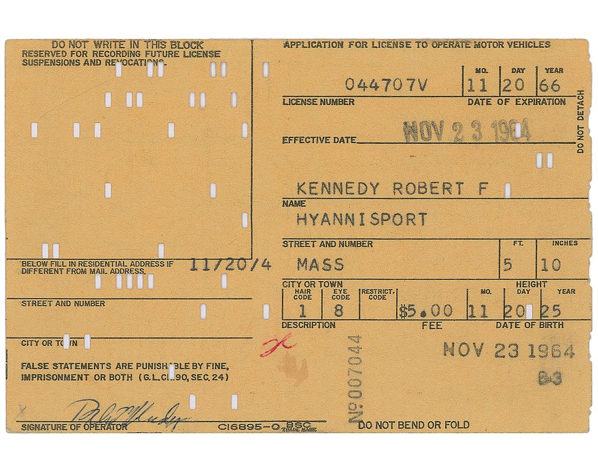 DS, one page, 4.75 x 3.25, November 20, 1966. Kennedy’s state of Massachusetts driver’s license renewal application, filled out in type with his personal information and signed in the lower left in blue ballpoint. In fine condition, with expected machine punches throughout and general document wear.