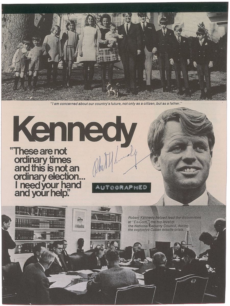 Page from Robert F. Kennedy’s presidential campaign brochure, 8 x 10.75, featuring a portrait of Kennedy between images of his family and him at work, signed in the center in blue ballpoint. Affixed along the top of a same-size cardstock sheet. Two horizontal folds, a strip of tape to top edge, and a Dymo label affixed below the signature, otherwise fine condition.