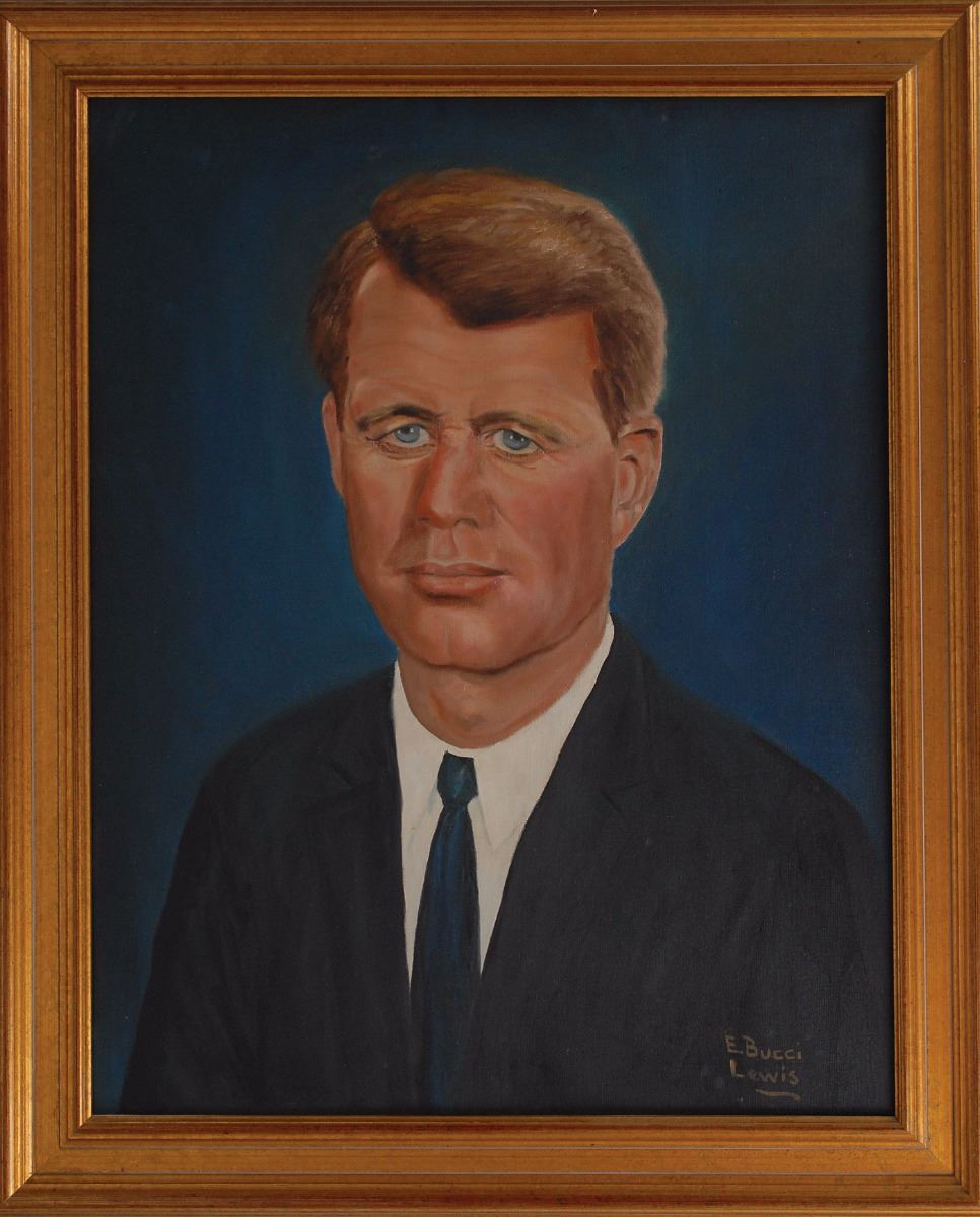 Original painting of Robert F. Kennedy, oil on canvas, 23.5 x 29.75, showing the former New York senator in a head-and-shoulders pose, signed in the lower right by the artist, “E. Bucci Lewis.” Framed to an overall size of 29.75 x 36. In fine condition. Oversized.