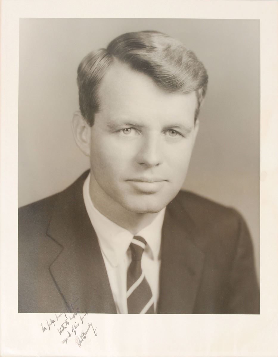 Wonderful vintage matte-finish 11 x 14 bust-length portrait of Kennedy, signed and inscribed in the lower border in fountain pen, “To Judge Irving Kaufman, with the highest regard of his friend, Robert F. Kennedy.” In fine condition, with slight overall rippling and a small water stain touching the first letter of the signature. In 1961, Irving Kaufman was promoted to an appellate position on the United States Court of Appeals for the Second Circuit by President John F. Kennedy.