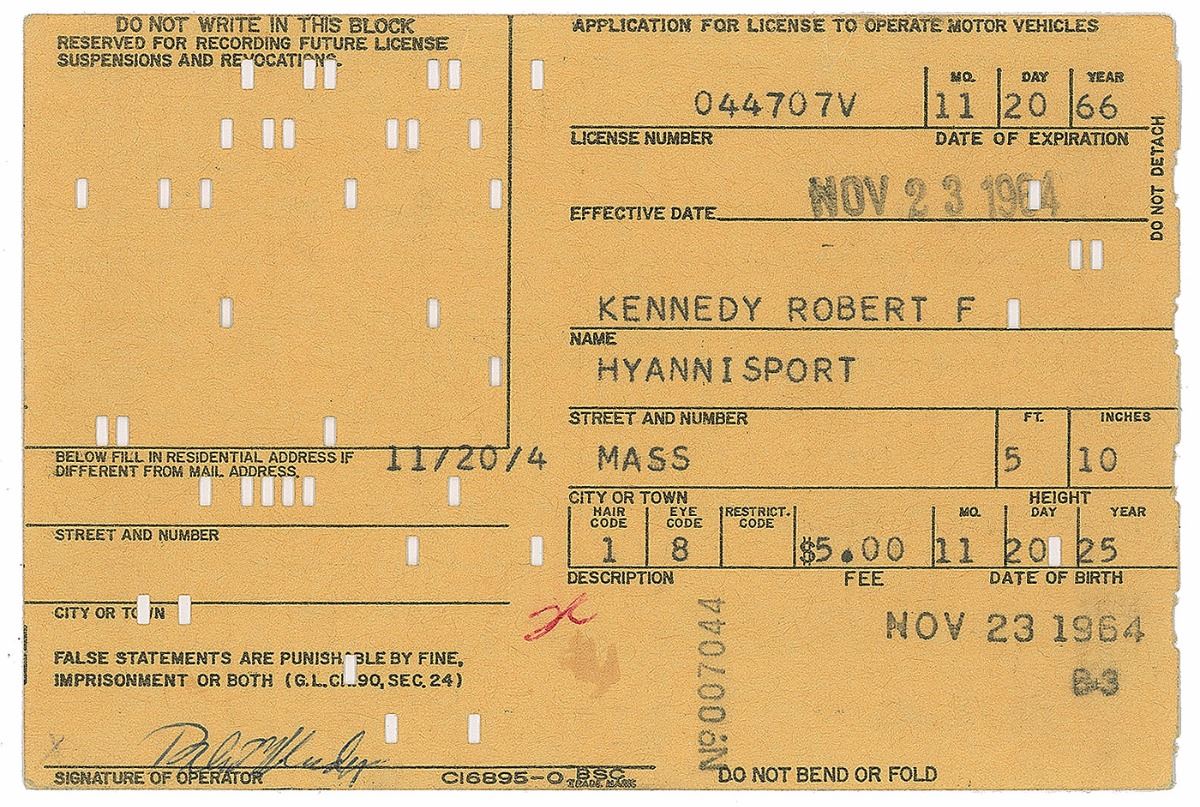 DS, one page, 4.75 x 3.25, November 23, 1964. Computer punch card for an application for license to operate motor vehicles issued to “Kennedy Robert F.” The card lists Kennedy’s license number, “044707V,” hometown, “Hyannisport,” height, “5–10,” and birth date, “11–20–25.” Signed at the conclusion in black ballpoint by Kennedy. In fine condition.
