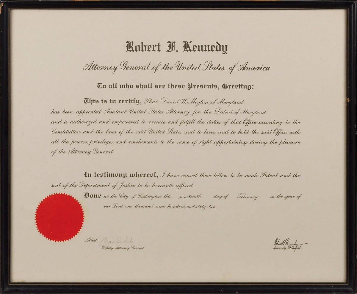 Partly-printed DS, one page, 16.5 x 13.5, February 19, 1962. As attorney general, Kennedy appoints Daniel W. Moylan as "Assistant United States Attorney for the District of Maryland." Signed at the conclusion by Attorney General Robert F. Kennedy and countersigned by Deputy Attorney General Byron R. White, who would later serve as an associate justice of the Supreme Court. The crisp red seal affixed to the lower left remains fully intact. Framed and in fine condition. Pre-certified PSA/DNA.