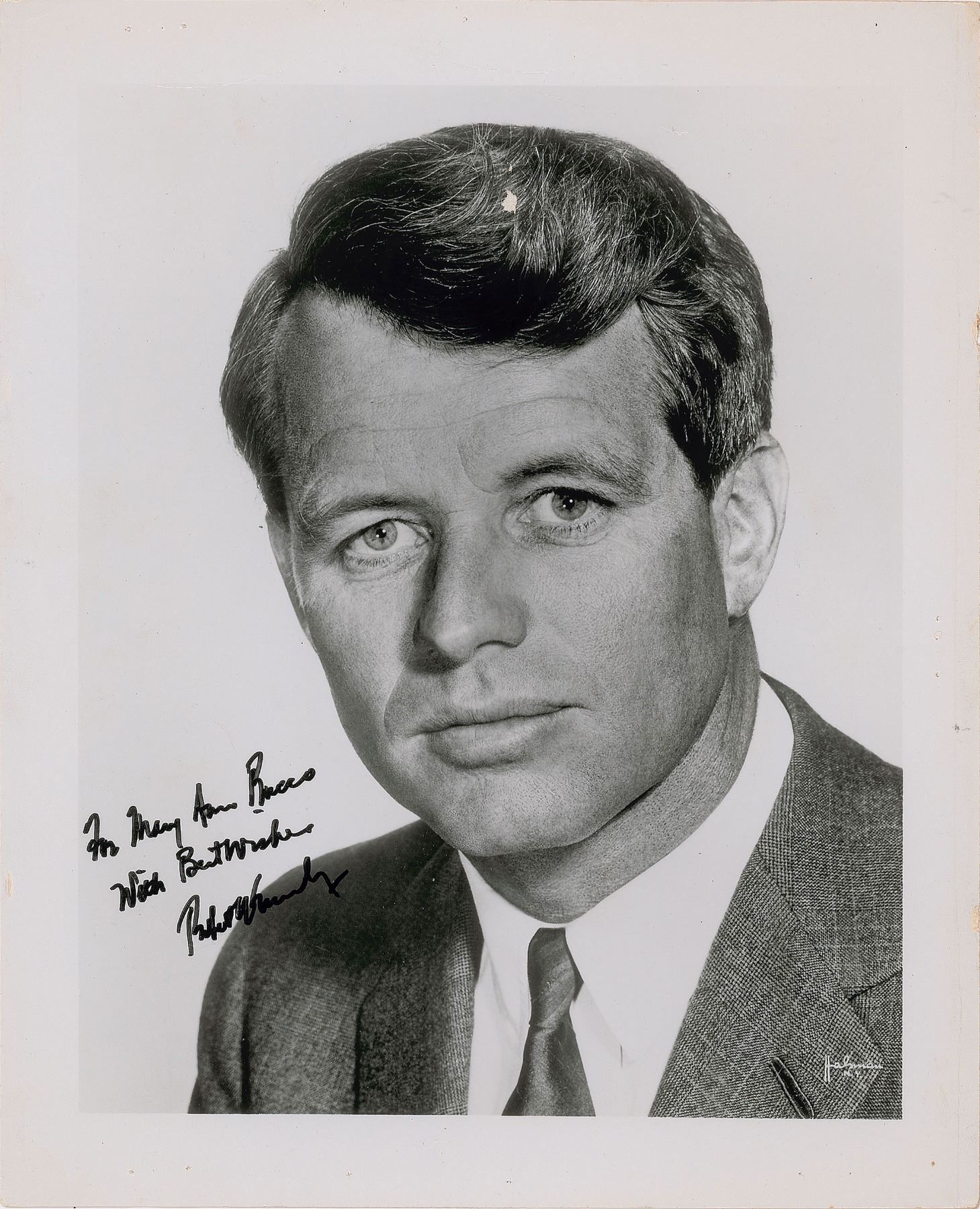 Vintage glossy 8 x 10 head-and-shoulders photo of Kennedy in a handsome suit and tie, boldly signed and inscribed in black felt tip, "For Mary Ann Rucco, With Best Wishes, Robert F. Kennedy.” In very good condition, with scattered creasing, staple holes in the borders, and a fleck of emulsion loss in Kennedy's hair.