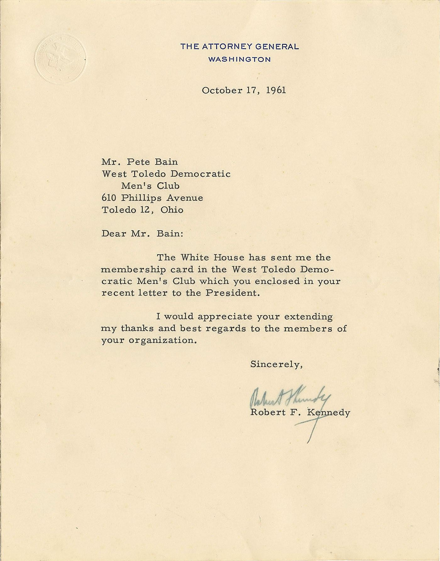 TLS, one page, 7 x 9, Attorney General letterhead, October 17, 1961. Letter to Pete Bain, in full: "The White House has sent me the membership card in the West Toledo Democratic Men's Club which you enclosed in your recent letter to the President. I would appreciate your extending my thanks and best regards to the members of your organization." In very good to fine condition, with light overall rippling, and slight blurring to the signature, from onetime exposure to moisture.