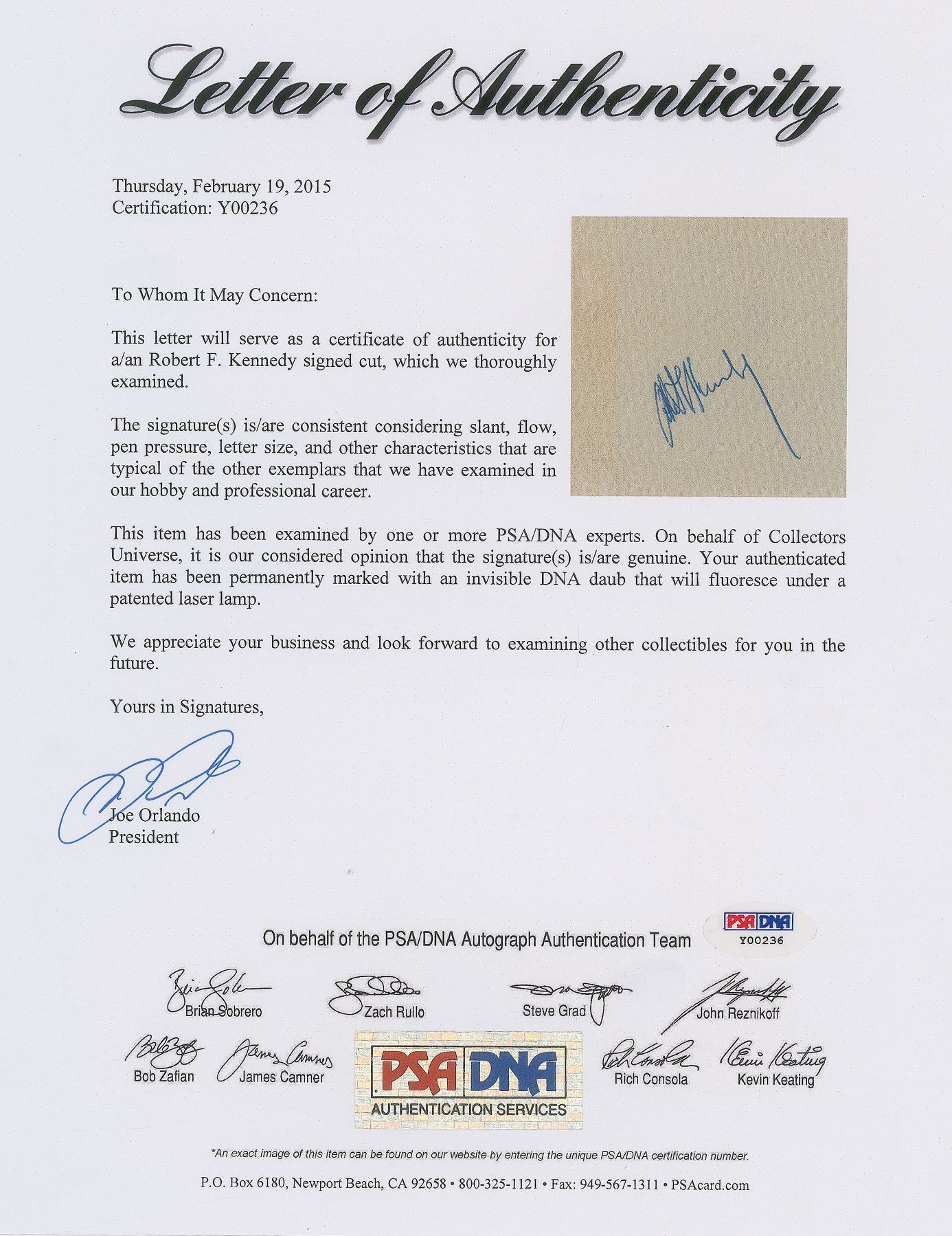Ballpoint signature, "Robert F. Kennedy," on an off-white 4.75 x 3.25 album page. In fine condition, with slightly irregular toning. Accompanied by a full letter of authenticity from PSA/DNA.