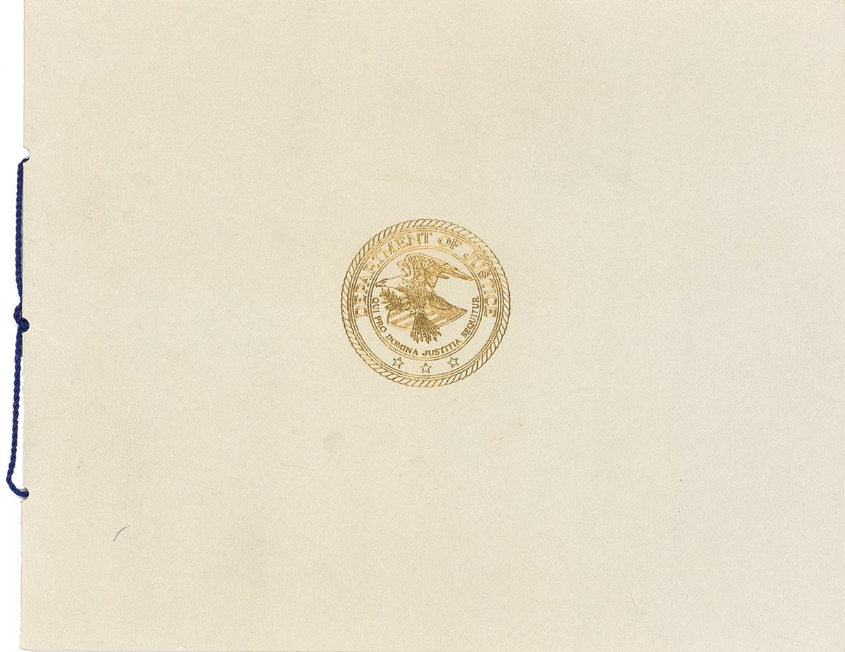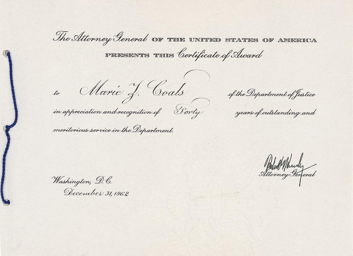 Partly-printed DS, two pages, 9.5 x 7, December 31, 1962. Certificate of award issued to Marie Coals for 40 years of service in the Justice Department. Signed at the conclusion in black ink by Kennedy. Award is housed in its original presentation folder. In very fine condition. Pre-certified PSA/DNA and RRAuction COA.