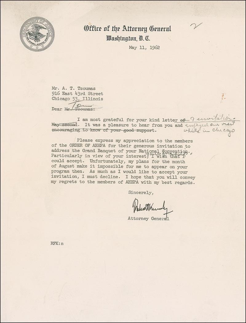 TLS, one page, 8.5 x 11, Office of the Attorney General letterhead, May 11, 1962. Letter to A. T. Thomas in Chicago. In part: “Please express my appreciation to the members of the Order of AHEPA for their generous invitation to address the Grand banquet of your National Convention…I wish that I could accept…As much as I would like to accept your invitation, I must decline.” In fine condition, with a uniform shade of toning and several secretarial pencil notations to text of letter.
