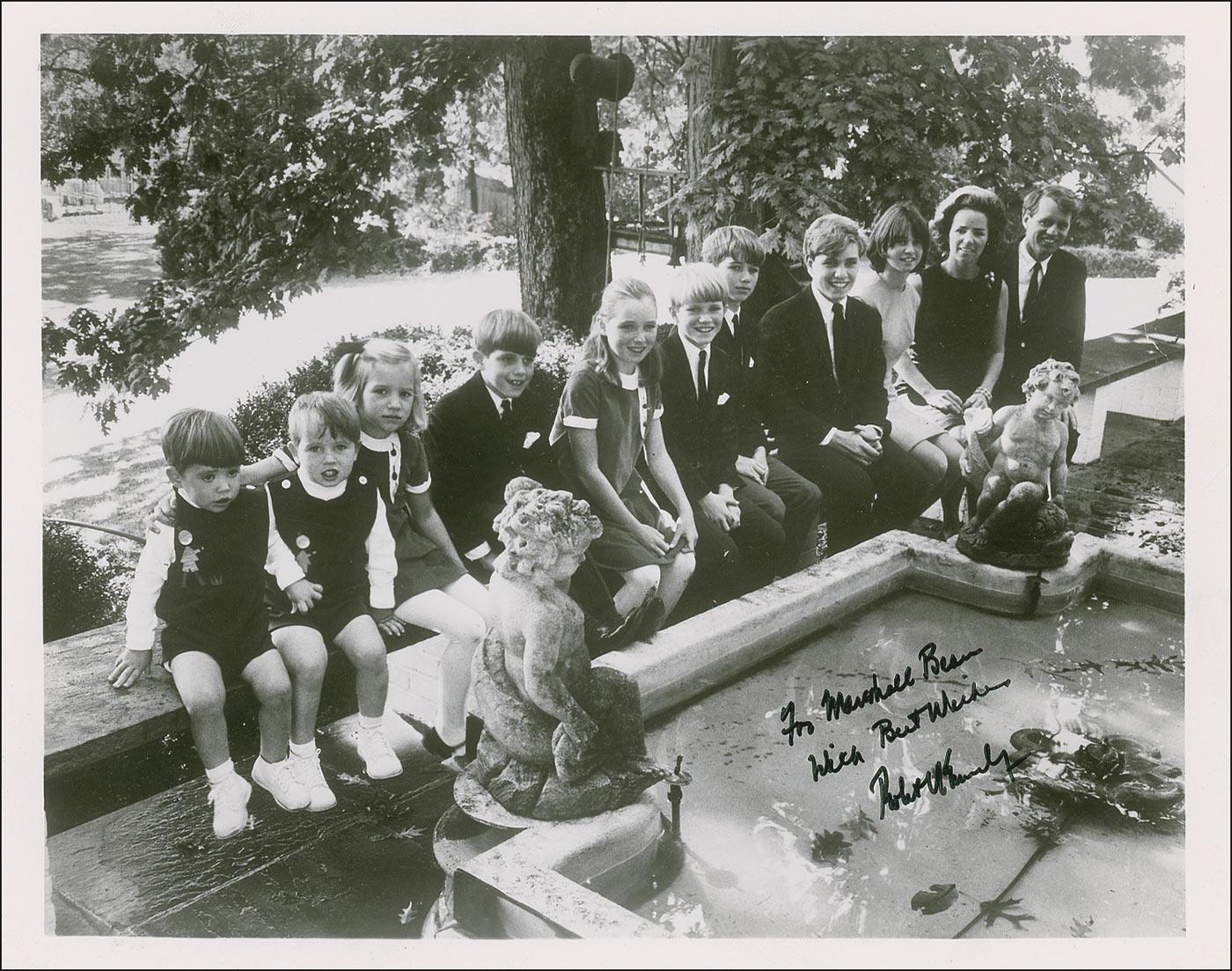 Vintage glossy 10 x 8 photo of Kennedy, his wife Ethel, and their nine children (at the time), most likely taken in the fall of 1966 at Hickory Hill, signed and inscribed in black felt tip “For Marshall Bean, with best wishes, Robert F. Kennedy.” In fine condition, with a few scattered light surface bends and creases. An attractive family portrait of the large, but not yet complete family. Kennedy’s tenth child, Douglas, was born on March 24, 1967; their eleventh child, Rory, was born on December 12, 1968, six months after her father’s assassination.