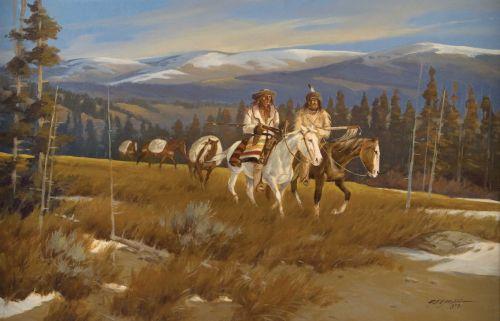 Robert F. Morgan (b. 1929), NWR. 20" x 30". Oil on Canvas. "Traveling to the Rendevous". (est $2,000-3,000)