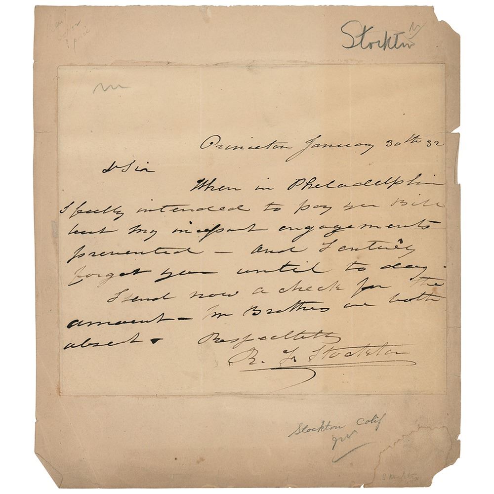 American commodore and politician (1795–1866) who played an integral role in the capture of California during the Mexican-American War, and was an early advocate for a propeller-driven, steam-powered navy. ALS signed “R. F. Stockton,†one page, 7.5 x 6.5, January 30, 1832. Handwritten letter from Princeton, in part: "When in Philadelphia I fully intended to pay your Bill but my incessant engagements prevented—and I entirely forgot you until today. I send now a check for the amount." Affixed to a larger sheet and in very good to fine condition, with a couple small edge tears.
