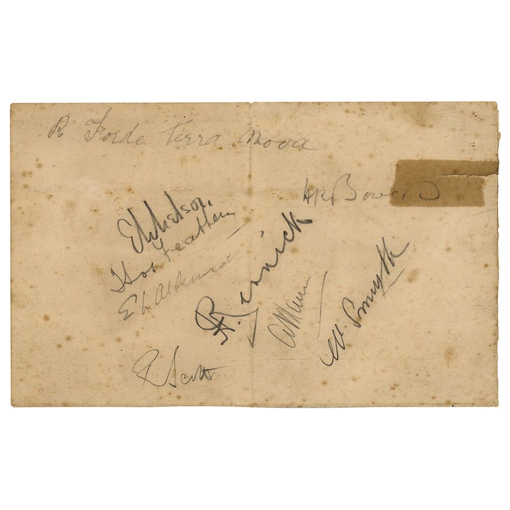 Scarce set of pencil signatures belonging to members of the Terra Nova Expedition—Robert Falcon Scott, “R. Scott,†Edward L. Atkinson, “E. L. Atkinson,†Henry Robertson Bowers, “H. R. Bowers,†Edward W. Nelson, “E. W. Nelson,†Henry Edward de Parny Rennick, “H. Rennick,†and two others. In very good condition, with creasing, intersecting folds, overall foxing, and an old tape stain touching Bowers' last name. The consignor notes that these signatures were obtained by Gladys Cazenave, the wife of William Cazenave, owner of the Diamond Boat Building Company in Cardiff, Wales, at the expedition’s farewell dinner held at Cardiff’s Royal Hotel on June 13, 1910.