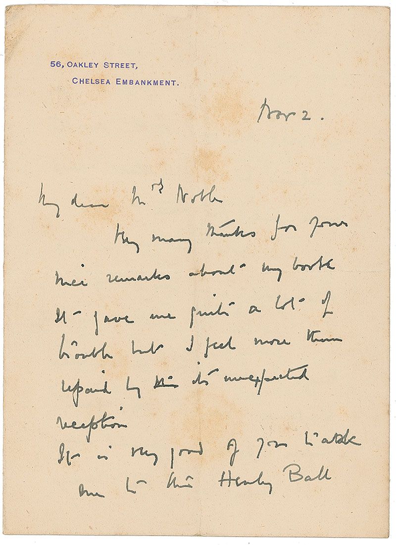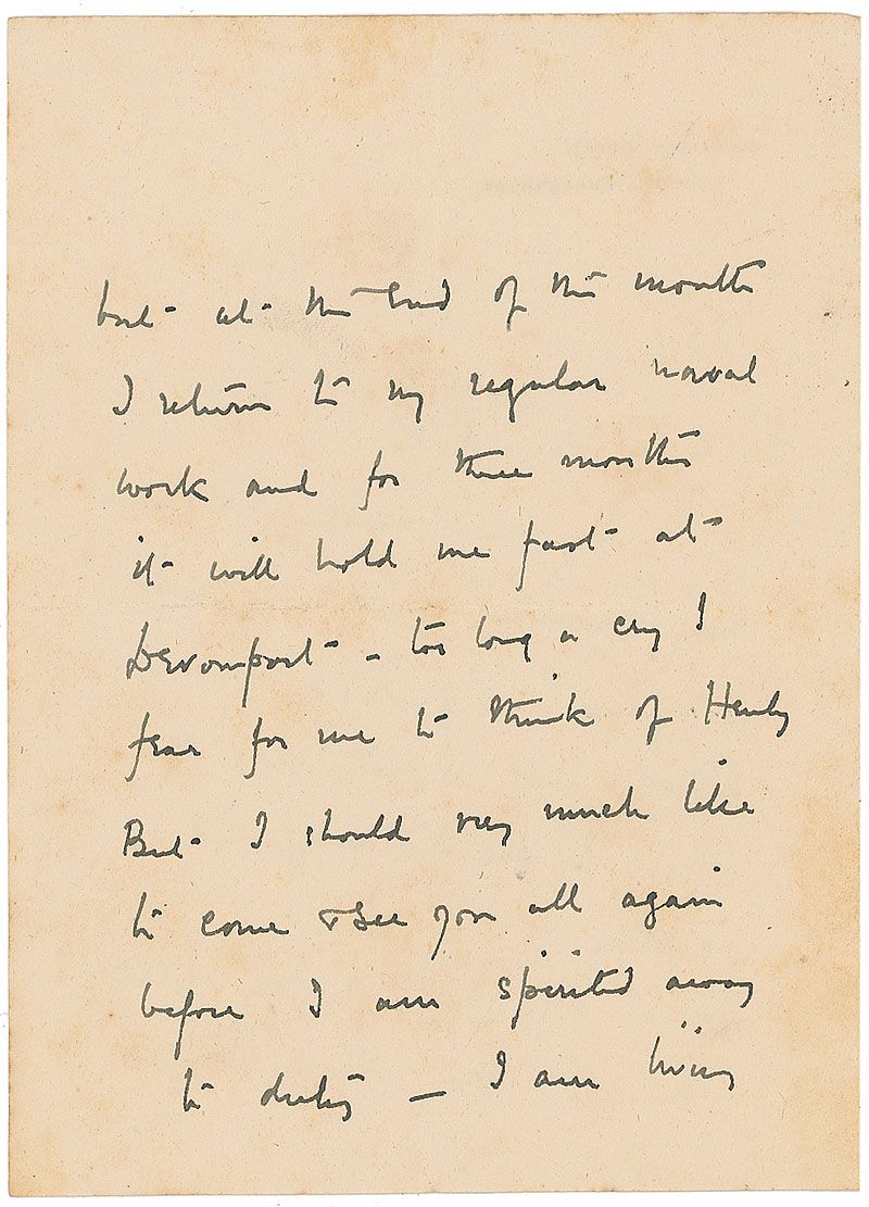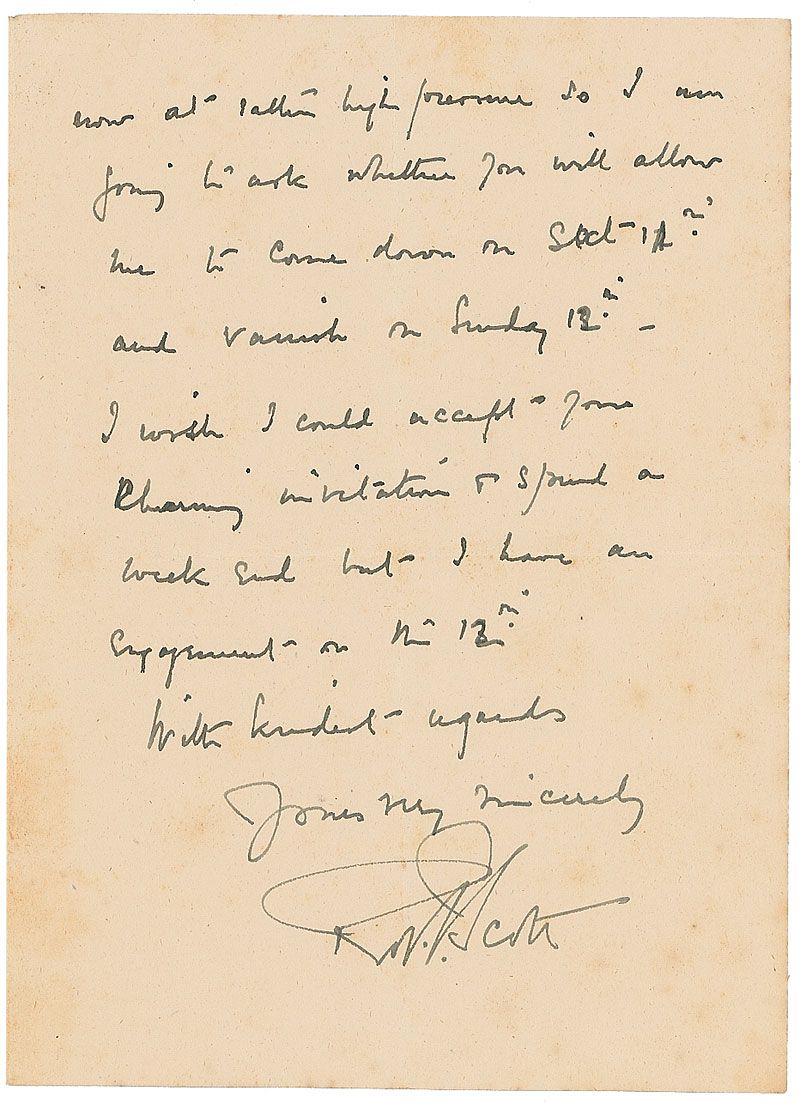 British naval officer and explorer (1868–1912) best known for the two expeditions he led to the Antarctic in 1901–1904 and 1910–1912. During the second of these, the Terra Nova Expedition, extreme weather, poor health, and a shortage of supplies led to the death of Scott and his party. ALS signed “Rob. F. Scott,” three pages on two adjoining sheets, 4.25 x 6, personal letterhead, November 2. Letter to Mrs. Noble. In full: “Very many thanks for your nice remarks about my book. It gave me quite a lot of trouble but I feel more than repaid by its unexpected reception. It is very good of you to ask me to the Henley Ball but at the end of this month I return to my regular naval work and for three months it will hold me fast at Devonport—too long a cry I fear for me to think of Henley. But I should very much like to come to see you again before I am spirited away to duty—I am living now at rather high pressure so I am going to ask whether you will allow me to come down on Sat 11th and vanish on Sunday 12th—I wish I could accept your charming invitation & spend a week end but I have an engagement on the 12th. With kindest regards.” Central horizontal and vertical folds, with vertical fold lightly passing through portion of signature, a few corner creases, and scattered light toning and foxing, otherwise fine condition. In October 1905, Scott published his book The Voyage of Discovery, recounting his 1901–1904 expedition to the Antarctic. When he returned from the Antarctic, he was welcomed as a national hero and took a leave of absence from the Navy to lecture about his voyage and write the book, which perhaps related to his “quite a lot of trouble” in completing the manuscript. Several months after the account’s “unexpected” enthusiastic reception, Scott would resume his full-time naval career as Assistant Director of Naval Intelligence in January 1906.