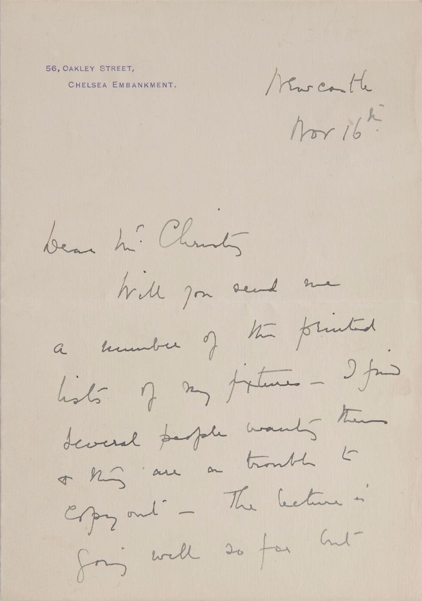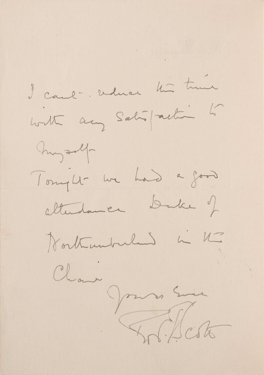 British naval officer and explorer (1868–1912) best known for the two expeditions he led to the Antarctic, the Discovery Expedition and the ill-fated Terra Nova Expedition. ALS signed “Robt. F. Scott,” one page both sides, 4.75 x 6.75, 56 Oakley Street letterhead, November 16 [1904]. Written from Newcastle, a letter to noted English lecture agent Gerald Christy, in full: “Will you send me a number of the printed lists of my fixtures—I find several people wanting them & they are a trouble to copy out—The lecture is going well so far but I can’t reduce the time with any satisfaction to myself. Tonight we had good attendance Duke of Northumberland in the Chair.” In fine condition. Scott returned from his three-year Antarctic ‘Discovery’ Expedition a hero in September 1904, and remained occupied with speaking engagements and the publication of The Voyage of Discovery before resuming his full-time naval career in 1906.