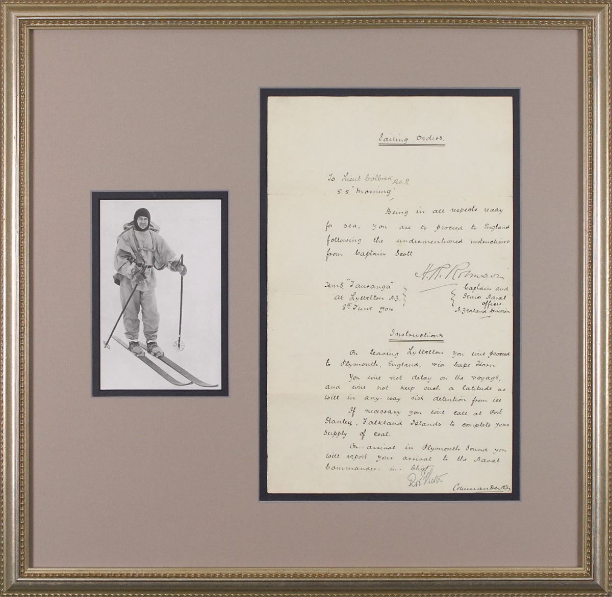 Manuscript DS, signed "R. F. Scott," one page, 8 x 13.25, H. M. S. Tauranga, June 8, 1904. Sailing orders addressed to Lieutenant William Colbeck of the S. S. Morning, docked in New Zealand. Orders read, in part: "Being in all aspects ready for sea, you are to proceed to England following the undermentioned instructions from Captain Scott…On leaving Lyttelton you will proceed to Plymouth, England, via Cape Horn. You will not delay on the voyage, and will not keep such latitude as will in any way risk detention from ice. If necessary you will call at Port Stanley, Falkland Islands to complete your supply of coal. On arrival in Plymouth Sound you will report your arrival to the Naval Commander." Matted and framed with an image of Scott on skis to an overall size of 20.25 x 20. In fine condition.