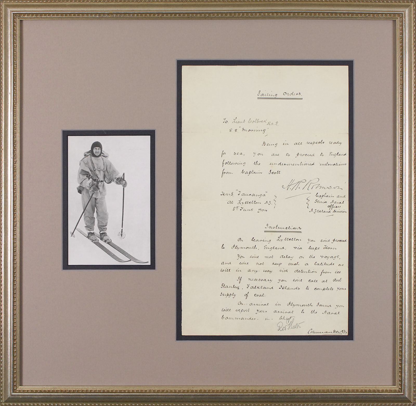Manuscript DS, signed "R. F. Scott," one page, 8 x 13.25, H. M. S. Tauranga, June 8, 1904. Sailing orders addressed to Lieutenant William Colbeck of the S. S. Morning, docked in New Zealand. Orders read, in part: "Being in all aspects ready for sea, you are to proceed to England following the undermentioned instructions from Captain Scott…On leaving Lyttelton you will proceed to Plymouth, England, via Cape Horn. You will not delay on the voyage, and will not keep such latitude as will in any way risk detention from ice. If necessary you will call at Port Stanley, Falkland Islands to complete your supply of coal. On arrival in Plymouth Sound you will report your arrival to the Naval Commander." Nicely matted and framed with an image of Scott on skis to an overall size of 20.25 x 20. In fine condition.