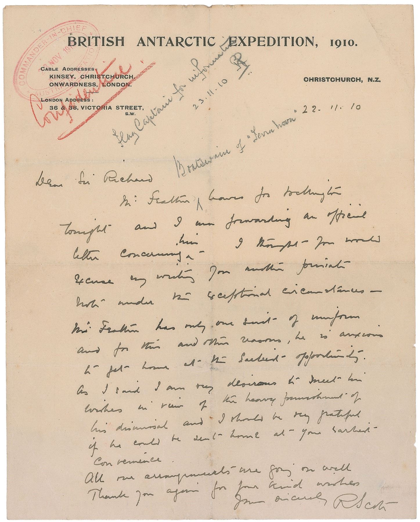 British naval officer and explorer (1868–1912) best known for the two expeditions he led to the Antarctic, the Discovery Expedition and the ill-fated Terra Nova Expedition. ALS signed "R. Scott," one page, 8 x 10, British Antarctic Expedition letterhead, November 22, 1910. Letter to Sir Richard Poore. In part: "Mr. Feather has only one suit of uniform and for this and other reasons, he is anxious to get home at the earliest opportunity. As I said I am very desirous to meet his wishes in view of the heavy punishment of his dismissal…All our arrangements are going on well." Intersecting folds, overall creases, tack holes to upper left, and a few tiny edge chips and tears, otherwise fine condition. Thomas A. Feather had been one of the members of Scott's Discovery Expedition from 1901-04 and proved an able crewman. He was assigned the position of boatswain for Terra Nova, but was reportedly discharged as a result of friction between him and Lieutenant Henry Rennick. By this point in time Scott was in Christchurch, New Zealand, about to begin the last leg of his journey to Antarctica just a week later on November 29.