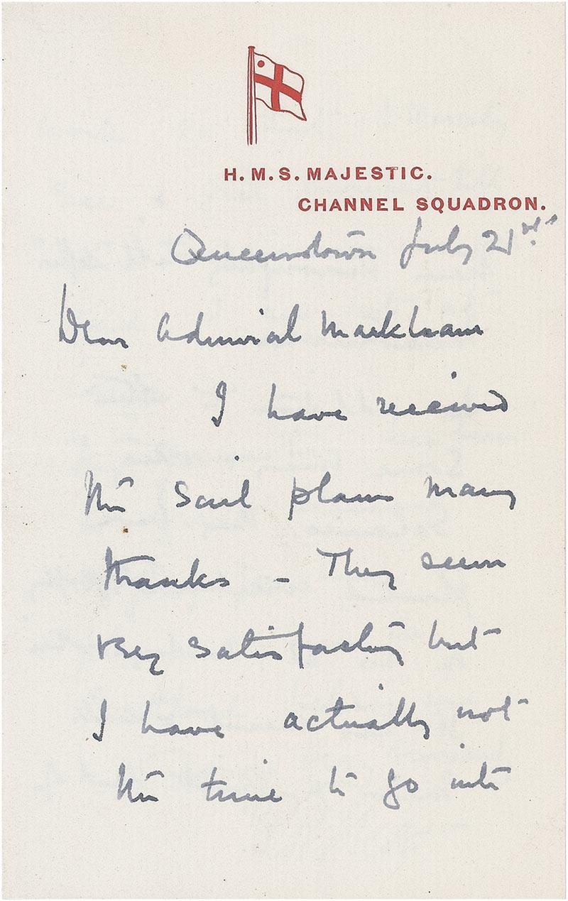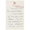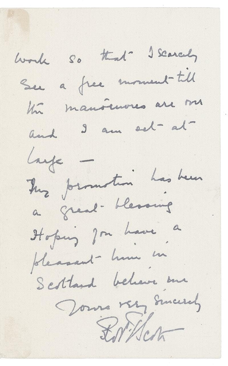 British naval officer and explorer (1868–1912) best known for the two expeditions he led to the Antarctic in 1901–1904 and 1910–1913. During the second of these, the Terra Nova Expedition, extreme weather, poor health, and a shortage of supplies led to the death of Scott and his party. ALS signed “Robt. F. Scott,” three pages on two adjoining sheets, 3.75 x 6, H.M.S. Majestic, Channel Squadron letterhead, July 21 [1900]. Letter to an admiral. In full: “I have received the sail plan many thanks—They seem very satisfactory but I have actually not the time to go into them thoroughly till after maneuvers. In addition to some…other schemes they have planted wireless telegraphy on us at 2 days notice. It has meant & will mean a great deal of work so that I scarcely see a free moment till the maneuvers are over and I am set at large. The promotion has been a great blessing. Hoping you have a pleasant time in Scotland.” In fine condition, with small areas of adhesive remnant along either side of the top of the inside hinge.