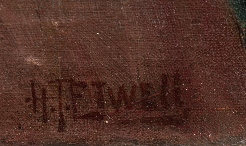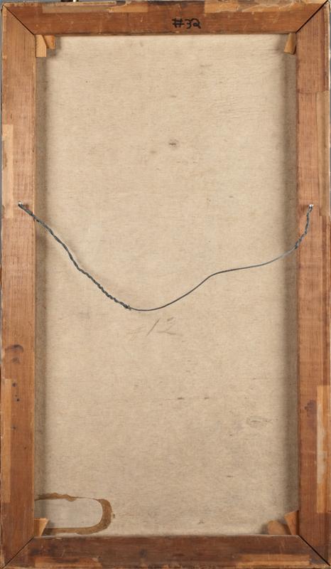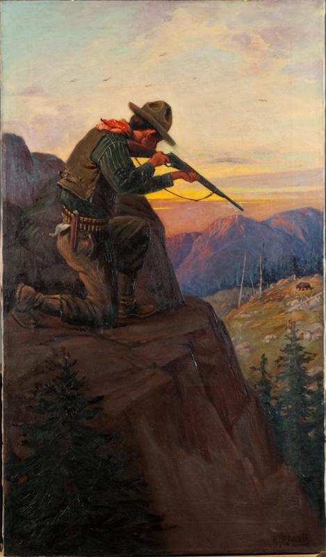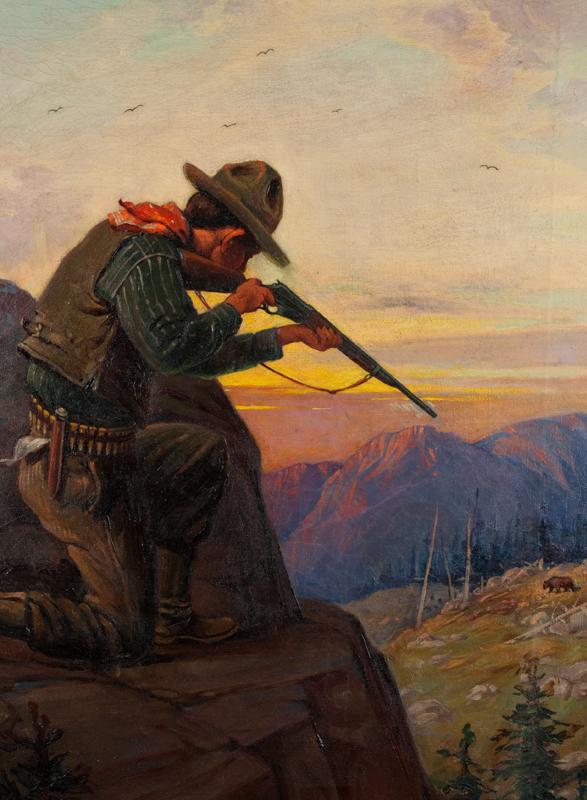 Painted to depict a cowboy on a hilltop shooting at a bear with his winchester model 1895, Robert Farrington Elwell, (1874-1962) Wyoming, Arizona was known for his western genre paintings, signed lower right, 31.25"H x 18"W, unframed, very nicley done.