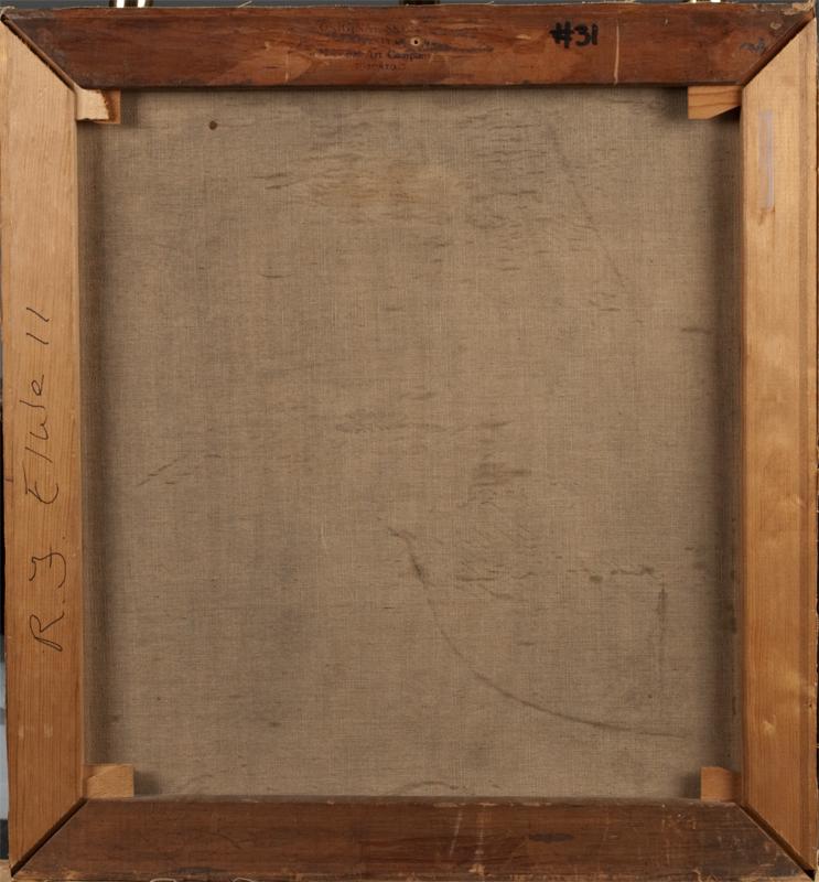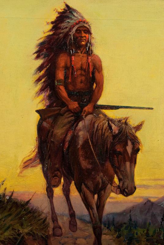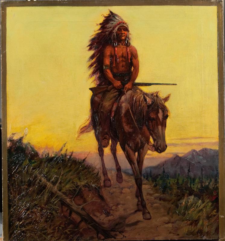 Painted to depict an indian on horse with his rifle, Robert Farrington Elwell, (1874-1962) Wyoming, Arizona, was known for his western genre paintings, signed on rear stretcher, with additional stamp stating that this is an original scetch and property of the National Art Company Toronto, 19.5"H x 18"W, unframed, very nice.