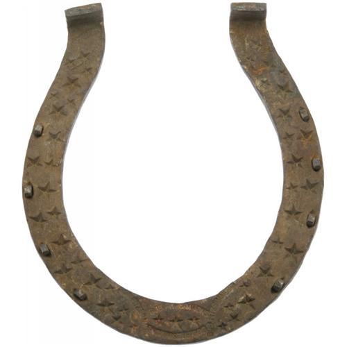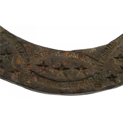 <B>Circa 1900 Oversized Horseshoe Forged by Robert Fitzsimmons.</B></I> The devastating punching power that earned Fitzsimmons an unprecedented three world titles is commonly believed to have been a result of an apprenticeship in his father's blacksmith shop. Here we have proof that the famed pugilist developed more than a strong upper body at the forge, as this oversized (9.5x11") iron horseshoe exhibits an impressive degree of artisanship. The backside is spangled with imprinted stars and Fitzsimmon's name in block lettering, and the shape and design is perfectly symmetrical. Very few pieces from the career and life of this early Champ have ever been made available to the collecting public, so bidders should see this as a very rare and important opportunity. <BR><BR><B>Important notice:</B> Heritage usually auctions material at the rate of 200-250 lots per hour. On some occasions eBay Live bid software or the Internet may not be able to keep up with the pace of the auction. We recommend placing a realistic absentee bid now as insurance to avoid disappointment. Occasionally the auctioneer may eliminate or reject an eBay Live bid, and the auctioneer may also reopen a lot after the close of the eBay live bidding (usually because we missed an audience bid), and may reject your bid even if it shows you as the winning bidder. By bidding via eBay Live, you agree that Heritage may award the lot to another bidder at its sole discretion under the circumstances described above or any other reasonable circumstances. Since eBay bids are not shown to us until we open the lot on the floor, we treat those bids just like floor bids. In most cases the floor responds before the eBay bid is presented to us, due to Internet lag time, so for consistency we have made it a policy that floor bids are always considered first over tie eBay live bids. Also please note that all Heritage lots purchased through eBay Live carry a 22.5% Buyer's Premium. Please make sure you read the Terms and Conditions before you bid. This lot is being auctioned in conjunction with a live floor auction by Heritage Galleries & Auctioneers. All final auction and invoice information will be supplied by Heritage Galleries & Auctioneers, and all other information should be considered preliminary. Lot:19138 <BR><BR><B>Winning Notification and Billing:</B> After the FINAL session in this auction is complete, Heritage will send e-mail and snail mail invoices. This process normally takes several days. All final auction and invoice information will be supplied by Heritage Galleries & Auctioneers, and all other information should be considered preliminary. <BR><BR>This auction will be conducted on a live auction floor and over the Internet through eBay Live. If you choose to place an absentee bid, please take a moment to <font color='#0000ff'><u><a href='http://pages.ebay.com/liveauctions/help/before/laabsentee.html'>learn how eBay Live absentee bidding works</a></u></font><font color='#000000'>