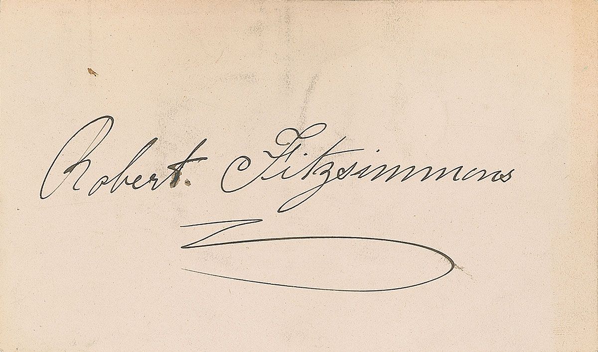 Legendary boxer (1863–1917) who was the sport’s first three-division world champion, winning the middleweight title in 1891, the heavyweight title in 1897, and the light-heavyweight title in 1903. Ink signature, “Robert Fitzsimmons,” on an off-white 4.5 x