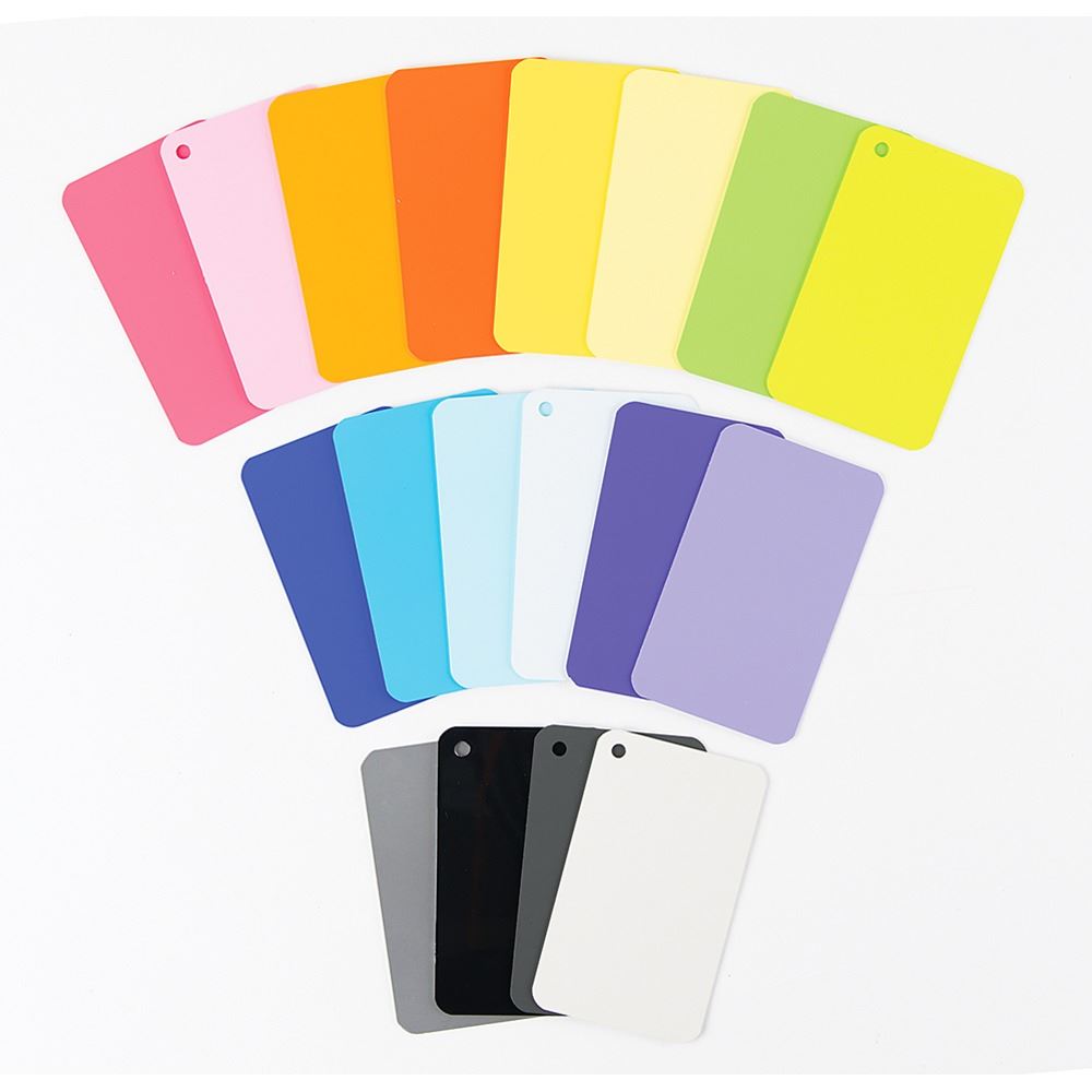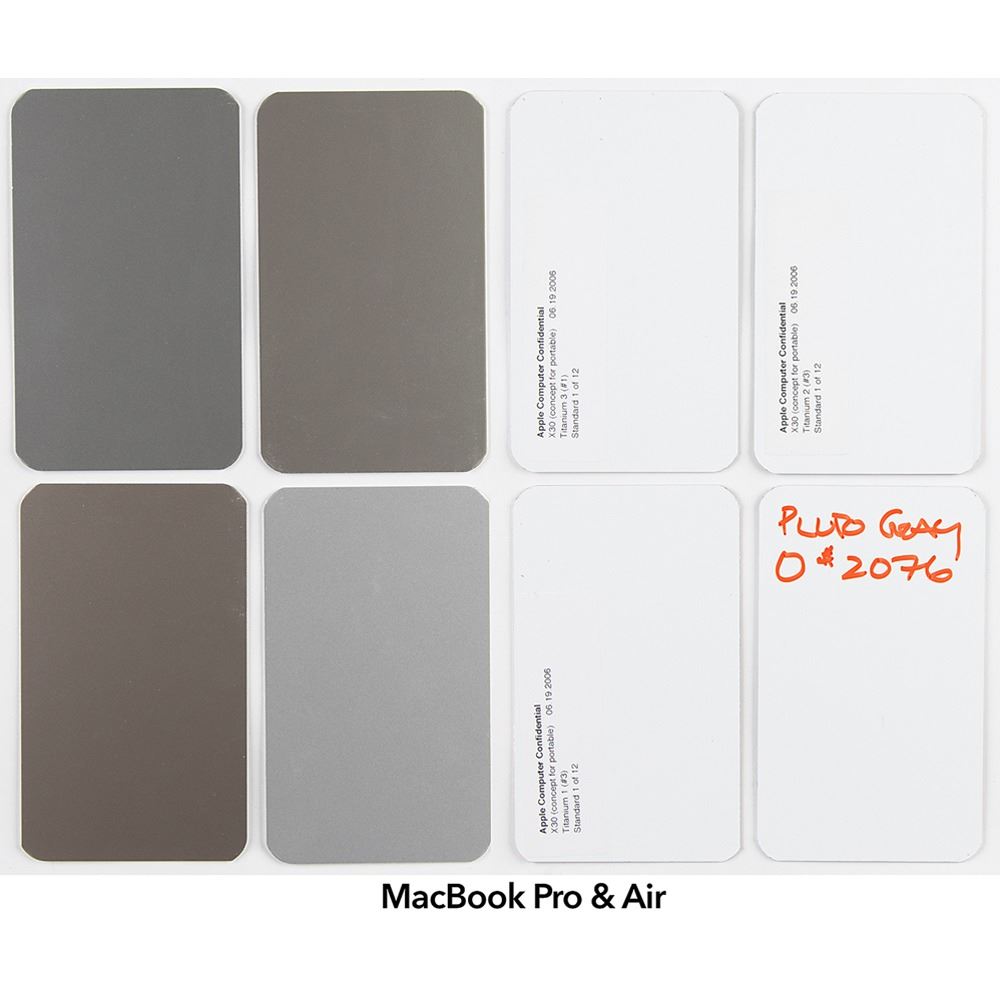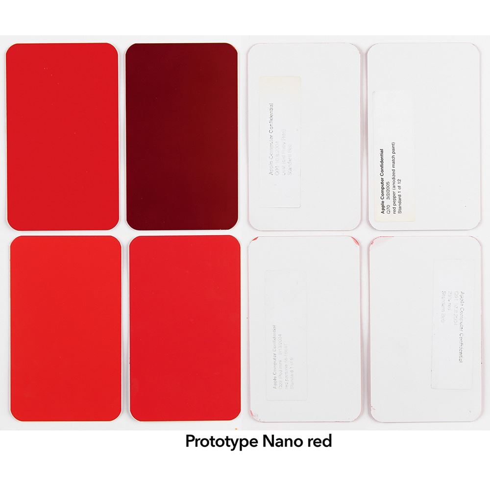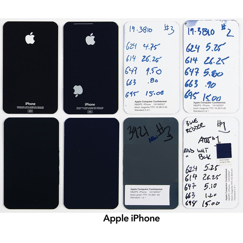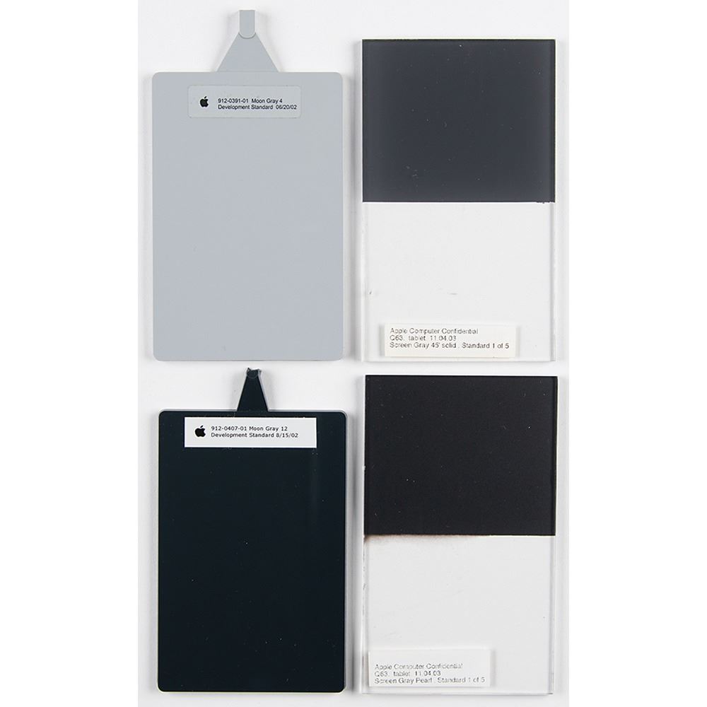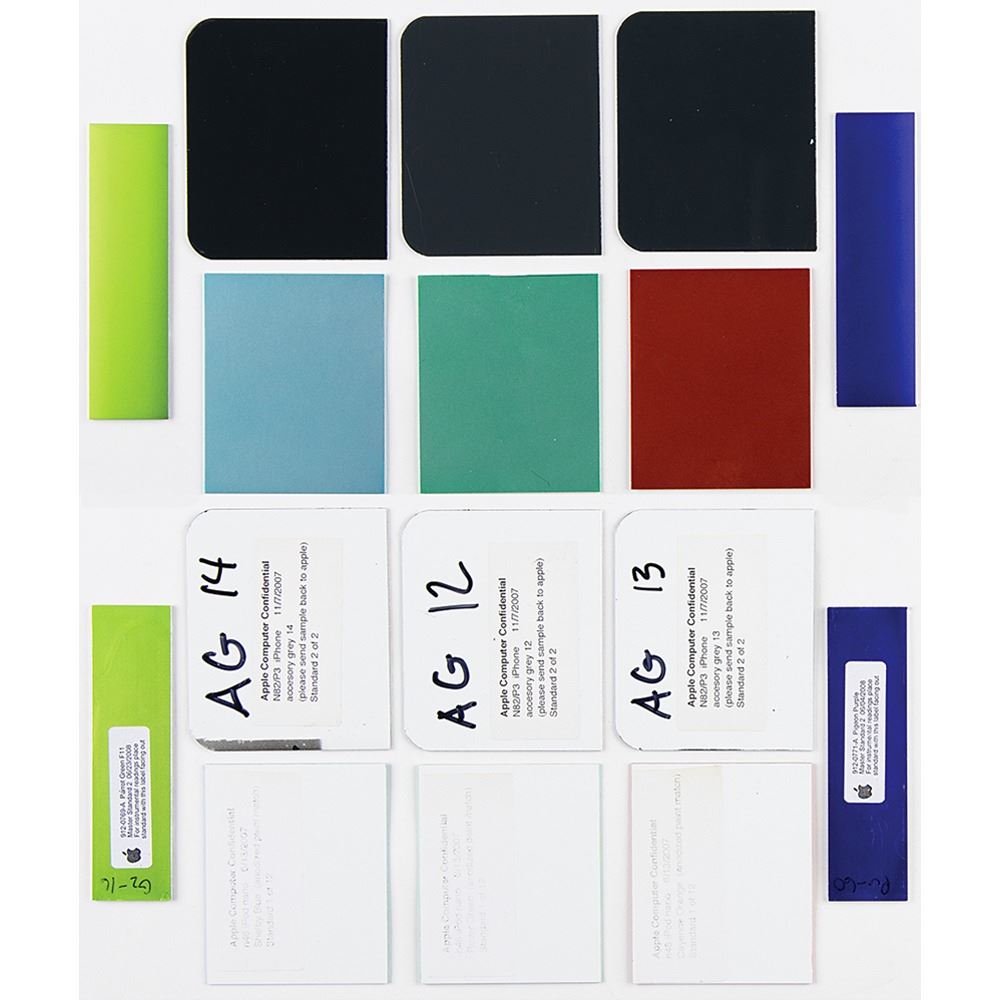 Flores developed his colors on pieces of aluminum and acrylic that were cut and fabricated in his shop. Each color was formulated with a documented recipe (color toner amounts in grams), mixed, and sprayed on this material with adjusted gloss levels. He worked directly with Apple's designers to conceive and create these colors, drawing inspiration from wherever it could be found. In one case, an industrial designer brought him out to see whether he could match the tone of the early morning sun hitting an office window. Once the colors were developed and approved, the formulations were provided to the plastic manufacturer so that they could produce cases for Apple's innovative hardware. Even as Apple graduated from rainbow-hued iMacs to stark white iPods and silver MacBooks, these colors were painstakingly developed using the same processes—seen in the dozens of iterations of whites, grays, and blacks within Flores's color swatch binders. When the iPod Mini reintroduced the rainbow to Apple's sleek-and-shiny product line, Flores developed those colors, too.