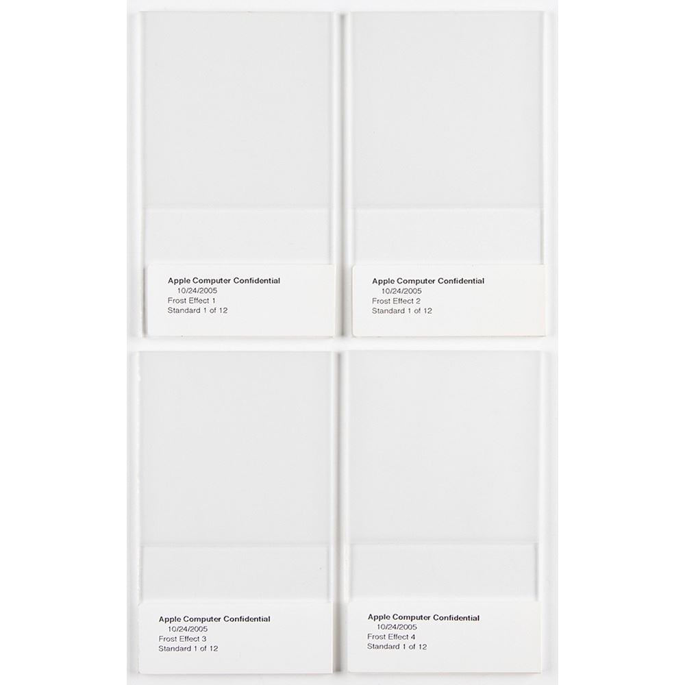Book 1 (Plastic Standards, c. 2002–2007): 27 plastic panels in various opaque colors (blacks and grays with names like "Mist 20," "Accessory Black," "Moon Gray 5," and "Moon Gray 10"), as well as transparent pieces demonstrating varying levels of a "Frost Effect." Many bear Apple labels differentiating the samples as "Development Standard," "Production Standard," "Master Standard," or "For Visual Comparison Only," while others are unlabeled.