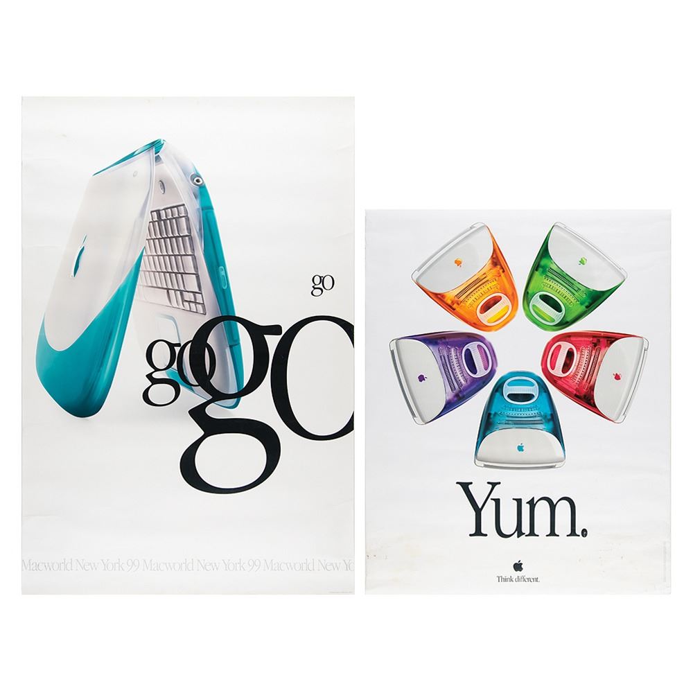 The 1997 return of Steve Jobs to Apple brought forth the iMac, and Flores' career as a premier industrial colorist began in earnest. Impressed by his expertise and fresh approach to color, Jobs relied on Flores to develop the bright, candy-like hues for the iMac line. These colors proved essential to the product's initial marketing campaigns, which included a TV ad featuring 'She's a Rainbow' by the Rolling Stones: gleaming iMacs tumble across the screen as Mick Jagger belts the chorus, 'She's like a rainbow / Coming, colors in the air / Oh, everywhere / She comes in colors.' A promotional poster of the flashy fruit-themed desktops—available in blueberry, grape, tangerine, lime, and strawberry—simply punctuated "Yum.," was also produced (an original copy from Flores's collection is included). The iMac became a bestselling sensation, and competitors followed suit with high-style computers of their own. Thus was the death knell of the beige PC.