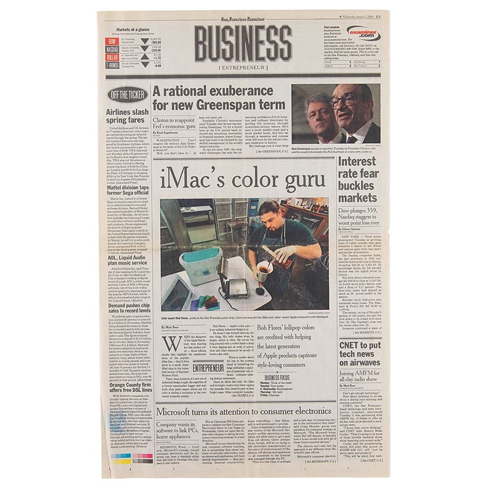 In addition to the binders of color swatches, a key element to this archive is Flores's 'recipe book'—a binder marked "Formulas"—with over 100 pages of printouts documenting the pigments and quantities used in his various colors, along with many pages of his handwritten notes regarding the same. Also included are: a binder with several images of Flores's paint shop and some examples of his work; a couple issues of Macworld; an official Apple flyer and promo poster advertising the 'blueberry' iBook G3 (an example of Flores's early work); and an original copy of the San Francisco Examiner's profile of Flores, entitled "iMac's Color guru," published on January 5, 2000. In overall fine condition.