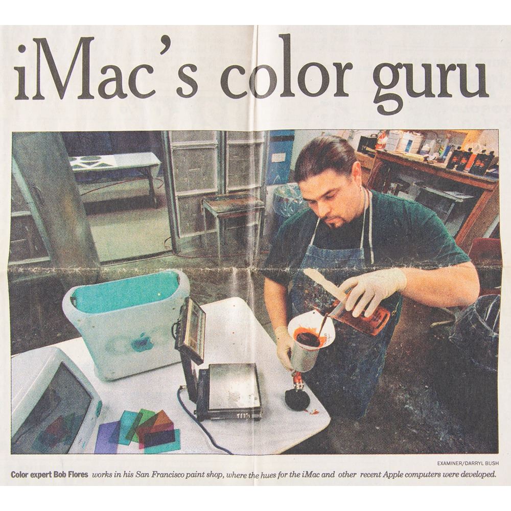 One-of-a-kind color swatch archive from the career of Bob Flores, the 'color guru' who developed the iconic palettes for Apple products such as the iMac, iPod, and iPhone. Flores got his start in the hot rod world, doing automotive airbrushing and pinstriping, before opening a San Francisco paint shop focused on business signage. He made his unlikely entry into the tech industry in 1996, when an Apple color consultant was referred to him to figure out how to perfect the metallic sheen of the Twentieth Anniversary Macintosh.