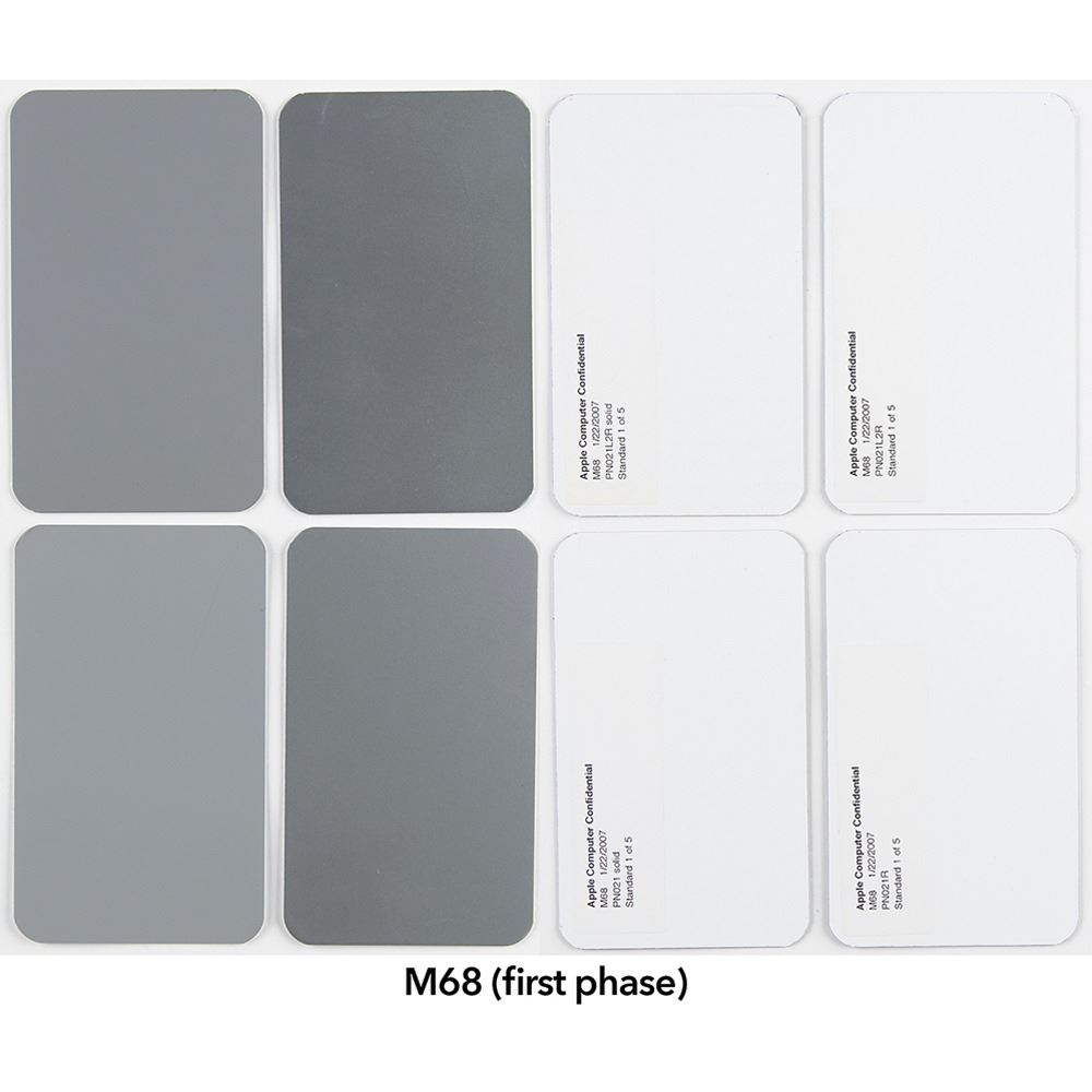 Book 6 (Gray/Neutral, c. 2004–2007): 98 panels in grays and neutrals, including some whites, blacks, beiges, and golds, with names like "Pluto Gray 0," "Titanium 1," "Tahoe Grey," "Moon Gray 1.5," "PN021 solid," "Eleanor Grey," "Matilda Grey," "Jane Grey," "Anne Grey," "Slot Gray," "Moon Grey 11 metallic," "Sea Shell," "Mist Gray #2," "Sun Grey 11," "Cosmic Grey 4," "Beige," "Extra Light Warm Metallic," "Sandoo," and "Goldoo." The "Pluto Gray 0" color is one that Flores is particularly proud of, as it was used for the MacBook Pro and MacBook Air. Four variants of "PN021," a silvery gray, are particularly significant, as they have Apple Computer labels dated 1/22/2007 that attribute them to the "M68" project—the codename for the original iPhone, which had been announced on January 9th and would be released six months later on June 29, 2007.