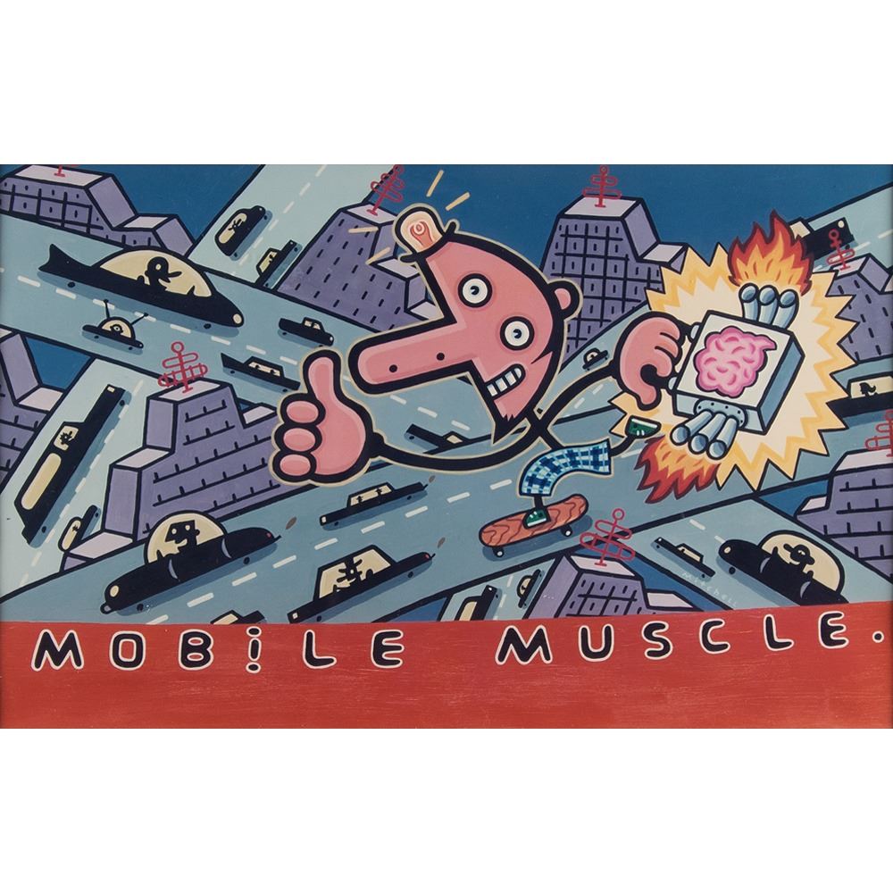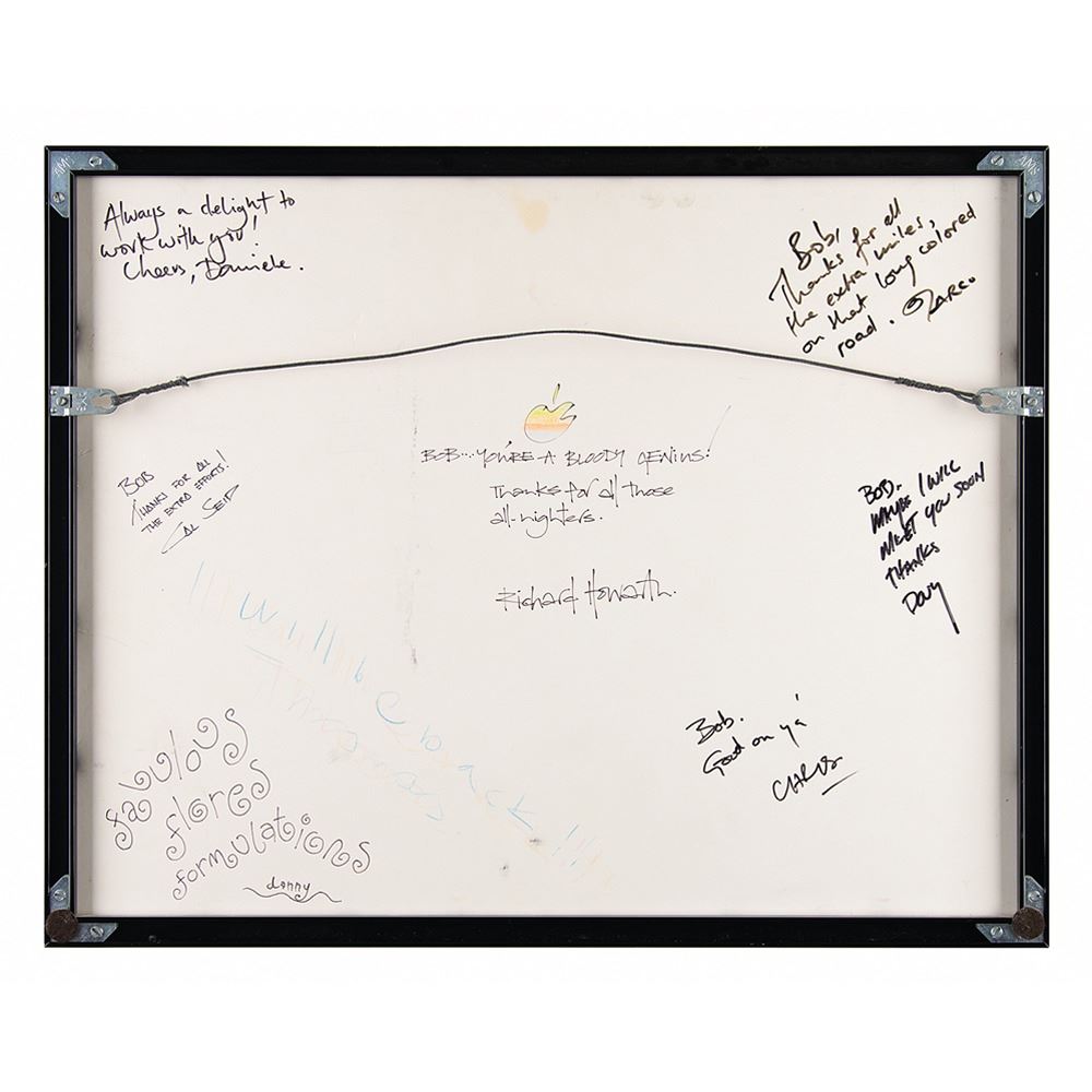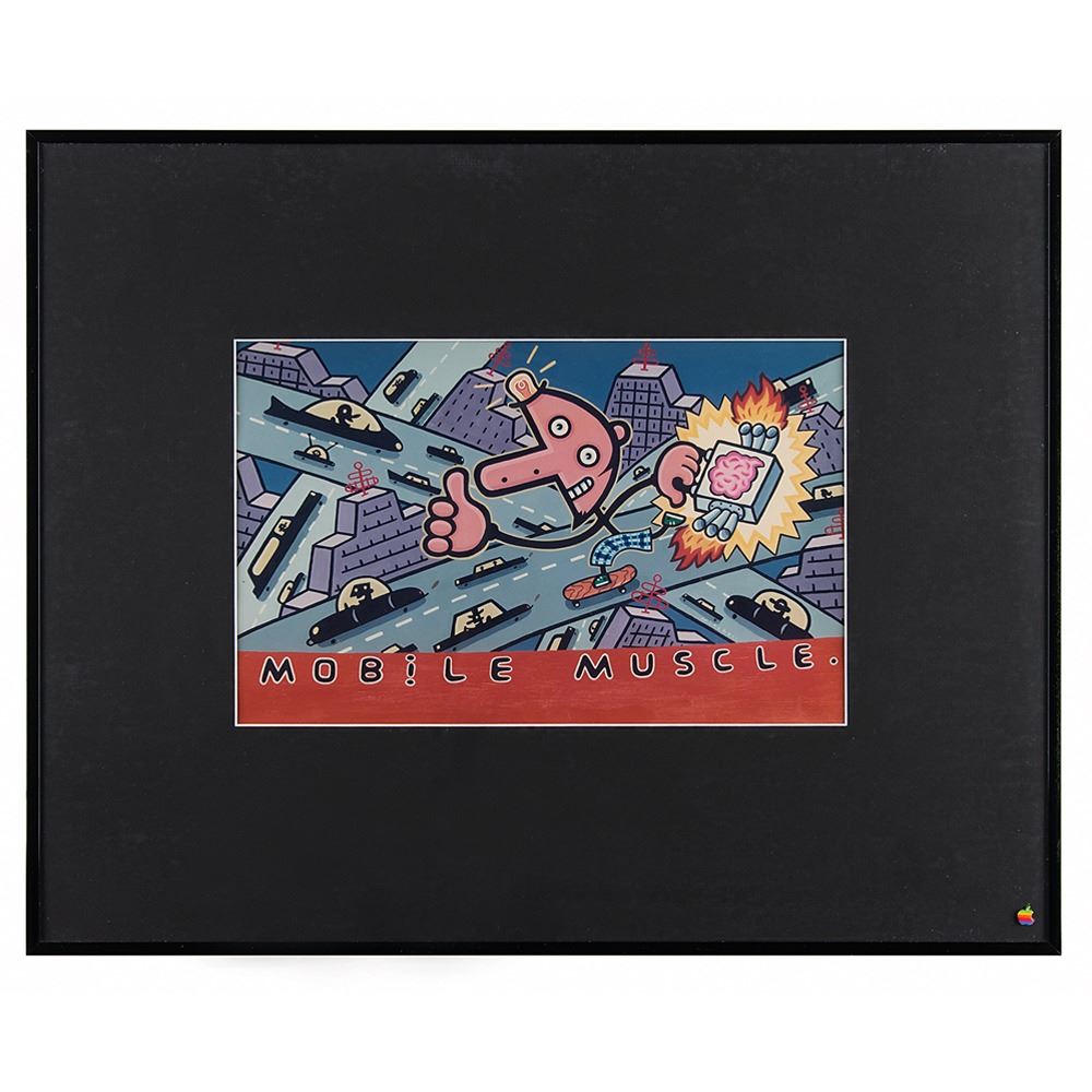 Color glossy 12 x 7.5 print entitled 'Mobile Muscle' affiliated with Apple's PowerBook 1400 notebook computer, matted and framed to an overall size of 20 x 16 with a small rainbow Apple emblem in the lower right corner. The frame's backing is signed and inscribed to Apple 'color guru' Bob Flores in black felt tip and colored pencil by eight members of Apple's design team, including Richard Howarth, who would go on to lead the design of each generation of iPhone from 2007 to 2015. Howarth writes, "Bob… You're a bloody genius! Thanks for all those all-nighters. Richard Howarth," sketching Apple's rainbow 'byte' logo above. This 'Mobile Muscle' graphic was used as one of several interchangeable 'BookCover' art skins issued with the Powerbook 1400, which allowed users to customize the look of their laptops. In fine condition, with scattered marks and soiling to reverse.