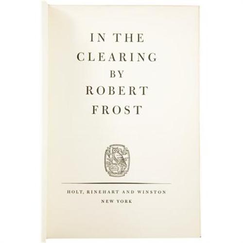 <B>Robert Frost: <I>In the Clearing</B></I></B></I> (New York: Holt, Rinehart and Winston, 1962), second printing, 101 pages, 8vo (6.25" x 9.25"), dust jacket. This marvelous collection pulls together several poems from Frost's later career, including the poem he read at the inauguration of John F. Kennedy. The book is in near fine condition, with a previous owner's gift inscription on the half title page and bottom edge wear. The dust jacket is about very good, with some mild edge wear present, as well as a phone number written in the middle of the front panel by a previous owner.<BR><BR><b>Shipping:</b> Books & Catalogs (<a target="_blank" href="http://www.heritageauctions.com/common/shipping.php">view shipping information</a>)