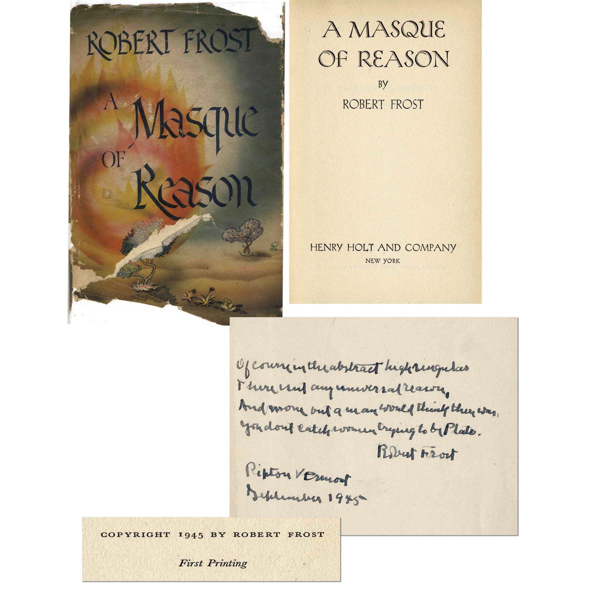 Robert Frost signed first edition, first printing of his 1945 play ''A Masque of Reason''. Henry Holt & Co.: New York: 1945. Frost pens upon the front free endpaper, ''Of course in the abstract high singular / There isn't any universal reason, / And none but a man would think there was. / You don't catch women trying to be Plato. / Robert Frost / Ripton Vermont / September 1945''. Play is in very good condition with uniform toning and a few discreet notations in pencil. Unclipped dustjacket is in fair condition with paper loss to edges.