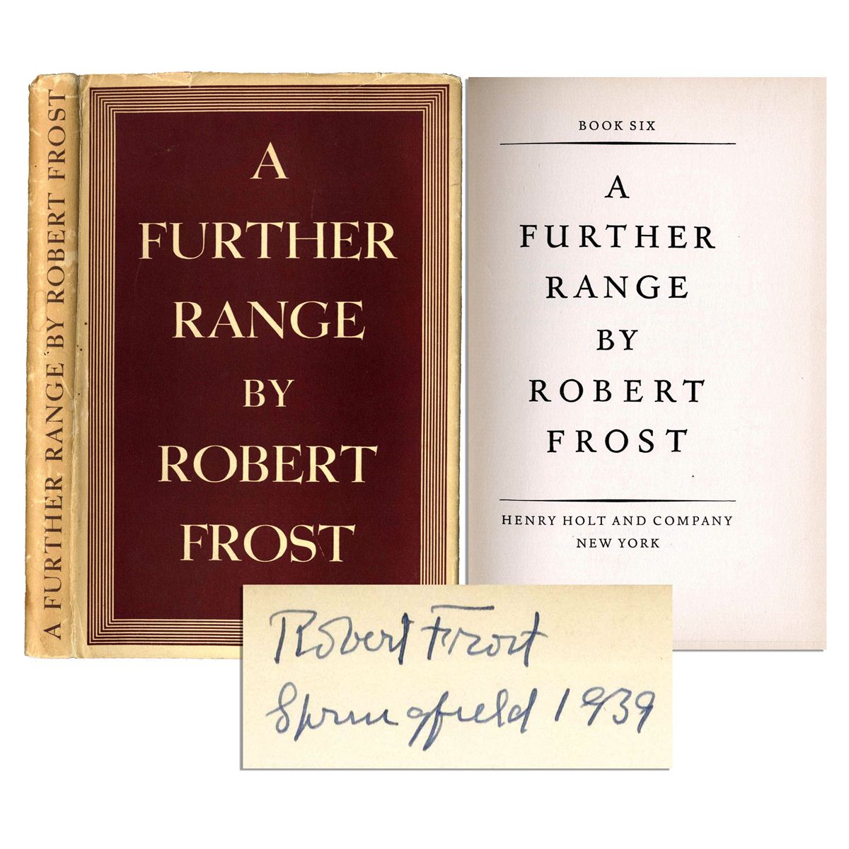 Robert Frost signed collection of poems, ''A Further Range.'' First edition published by Henry Holt & Co.: New York: 1936. The poet signs upon the front free endpaper, ''Robert Frost / Springfield 1939''. The 102pp. collection includes ''Two Tramps in Mud Time'' and ''Neither Out Far Nor In Deep''. Unclipped dustjacket with minor edge wear and one small tear is in very good condition. The 5.75'' x 8.75'' volume with red cloth boards and gilt lettering shows toning throughout, else very good. A beautiful collection by the famed naturalist poet.