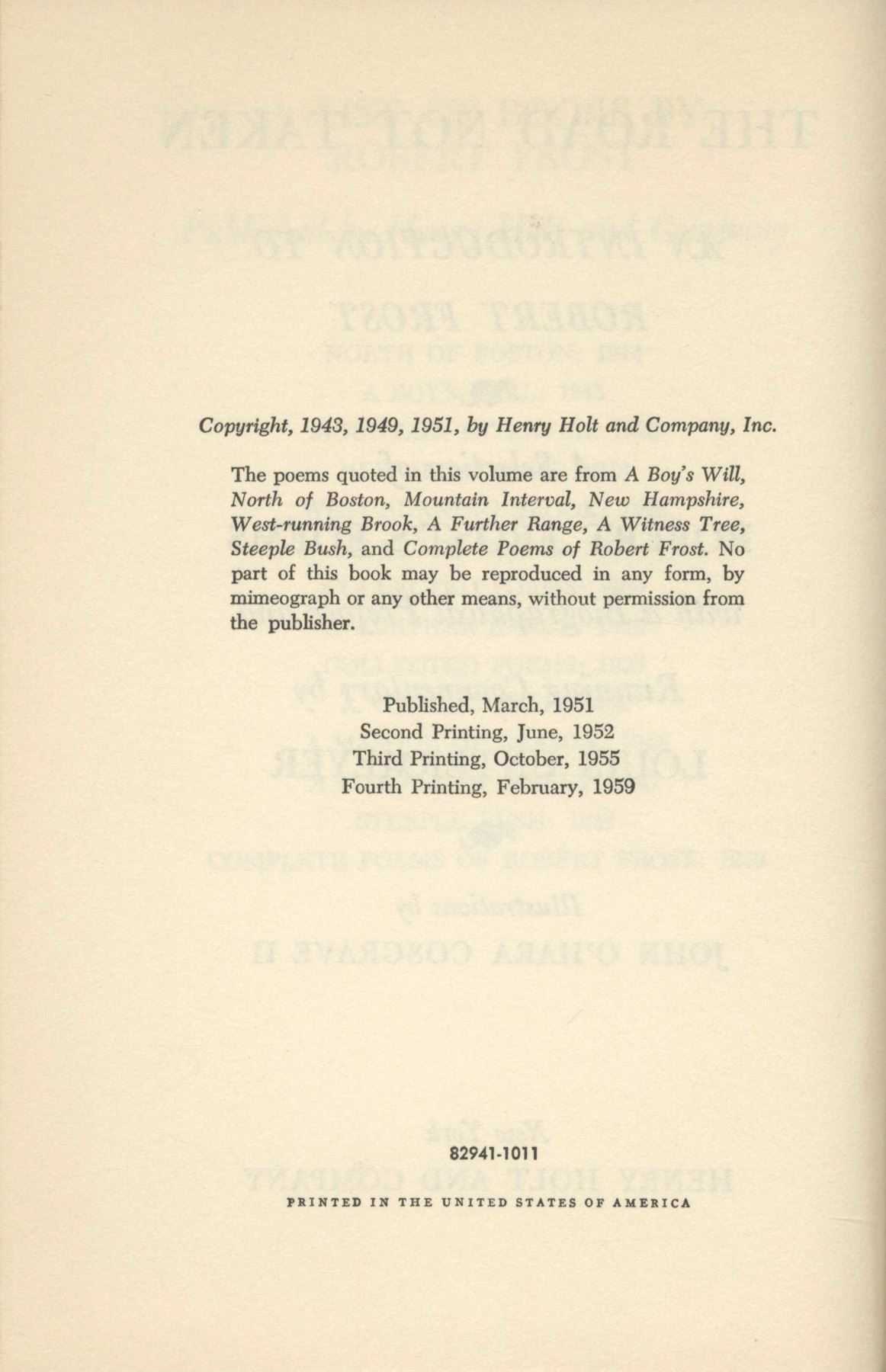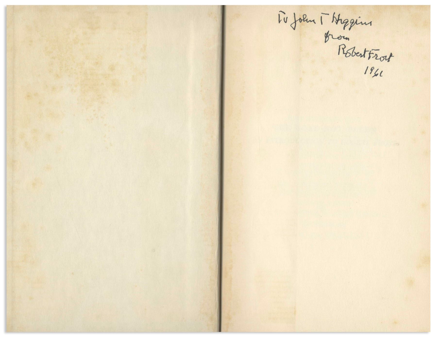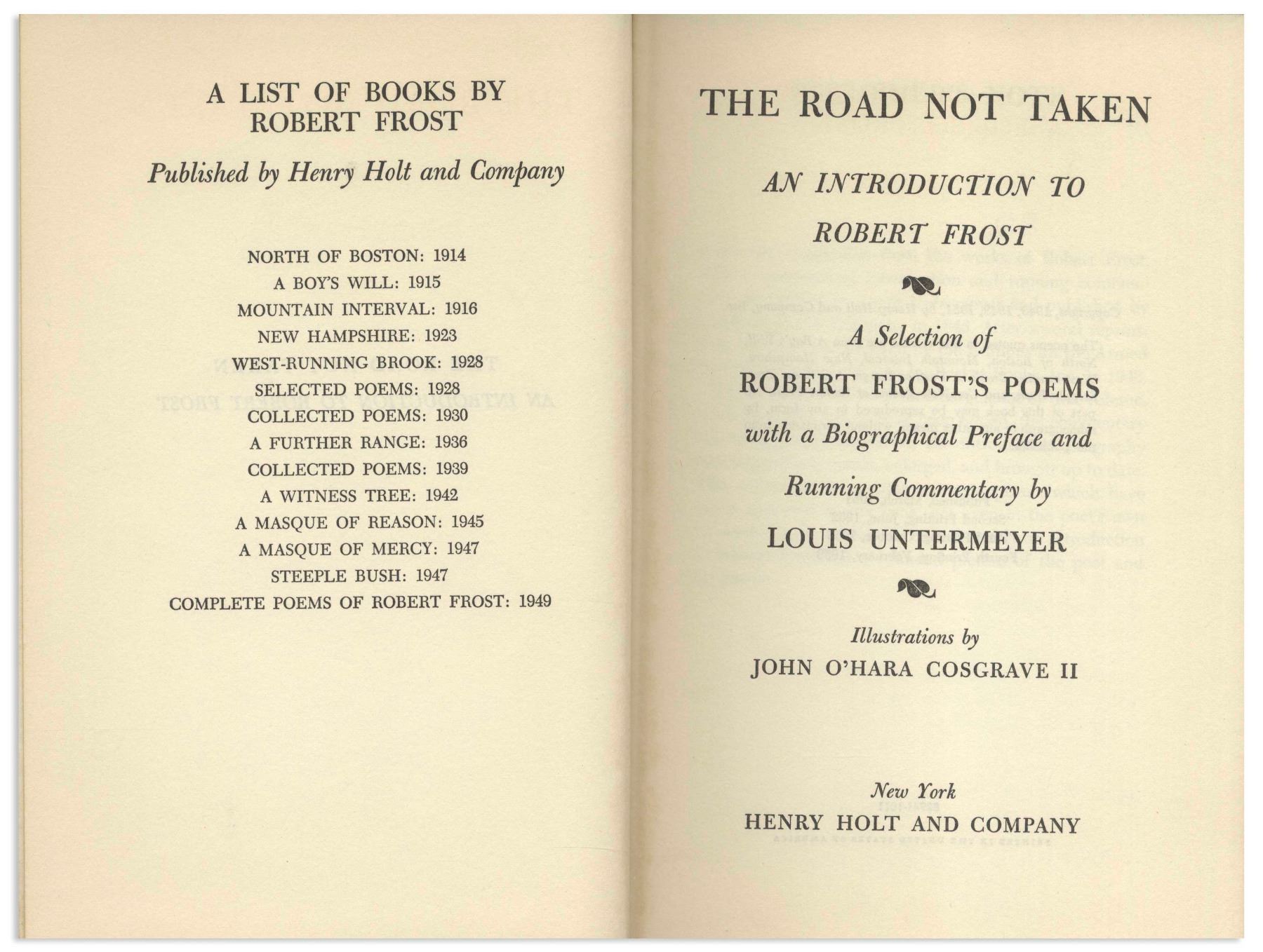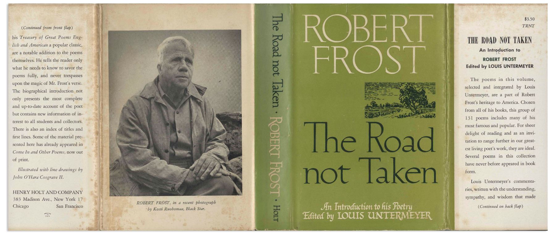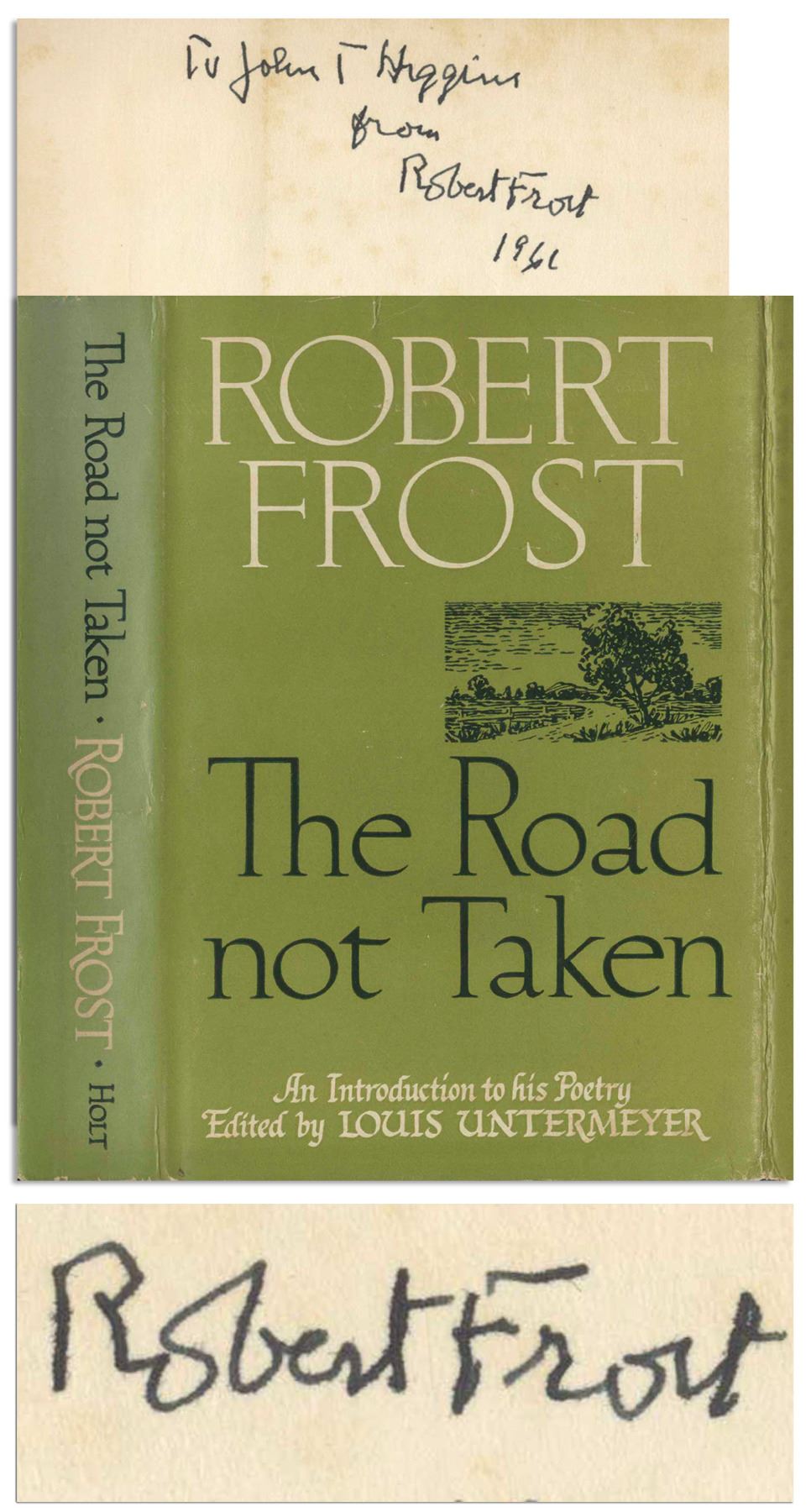Robert Frost signed copy of his famed poetry compilation, ''The Road Not Taken''. New York: Henry Holt and Co., 1955 fourth printing. Frost signs the front free endpaper in black felt-tip, ''To John T. Higgins / from / Robert Frost / 1961'', inscribed to the father of noted crime author George V. Higgins. Bound in green cloth boards, book runs 282pp., with illustrations throughout. Light foxing to endpapers, otherwise near fine condition. In original dust jacket showing price of $3.50. Also some foxing to jacket, in very good condition.