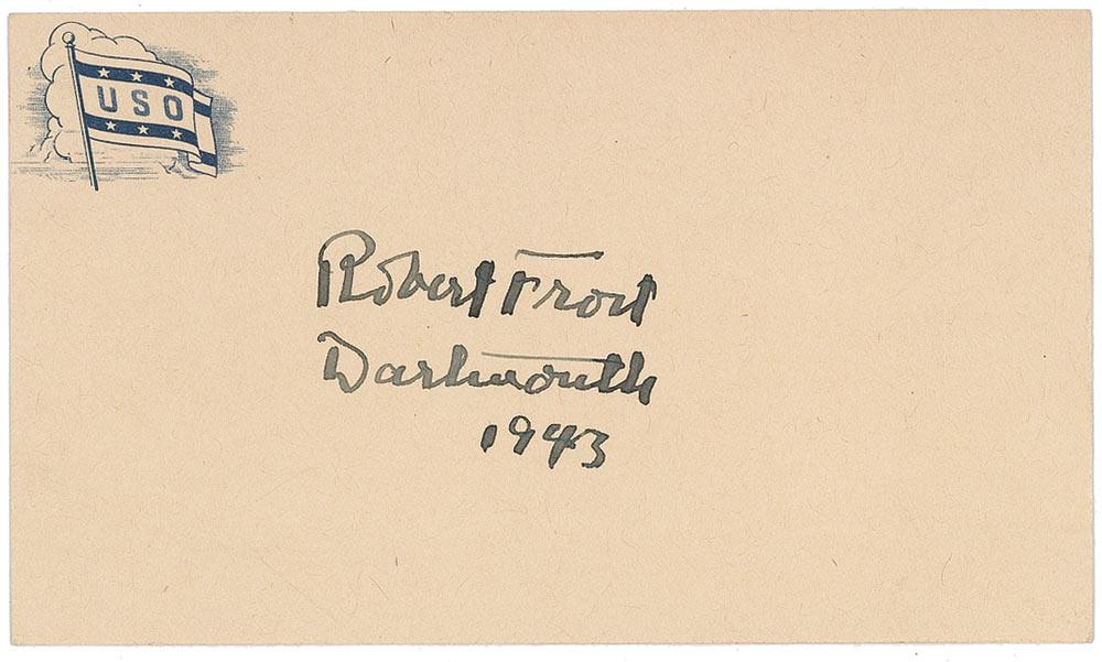 Superb fountain pen signature, “Robert Frost, Dartmouth, 1943,” on an off-white 5.5 x 3.25 USO postcard. In fine condition. A superb and highly displayable World War II example from the four time Pulitzer Prize winner.