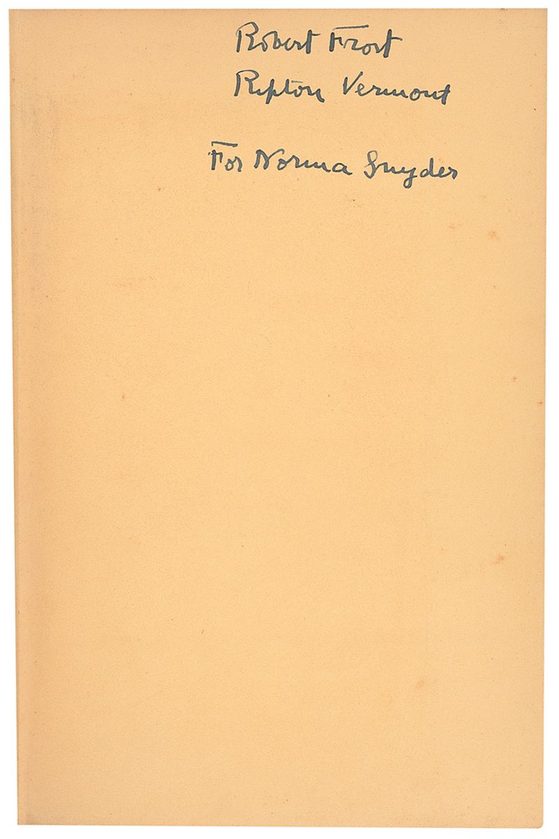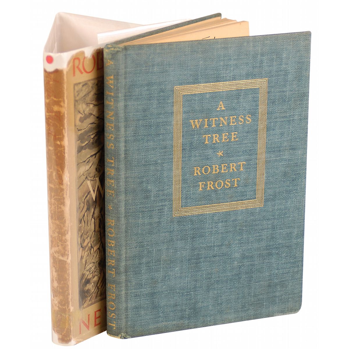 Signed book: A Witness Tree. Later printing. NY: Henry Holt and Company, 1942. Hardcover with dustjacket, 6 x 8.75, 91 pages. Boldly signed and inscribed on the first free end page, “Robert Frost, Ripton, Vermont for Norma Snyder.” In very good condition, with owner’s bookplate to front pastedown, slight foxing to signed page, mild toning to inside pages, a bit of light toning to boards, and toning, creasing, and scattered light paper loss to the clipped dustjacket.