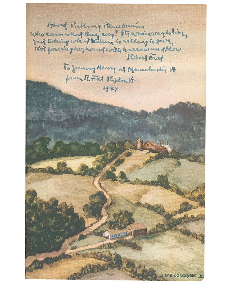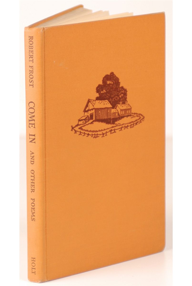 Signed book: Come In. Later printing. NY: Henry Holt and Company, 1945. Hardcover, 5.5 x 8.5, 192 pages. Signed on the first free end page, “About Picking Blueberries, Who cares what they say? It’s a nice way to live, Just taking what Nature is willing to give, Not forcing her hand with harrow and plow. Robert Frost To Jimmy Henry of Manchester Vt from R.F. at Ripton Vt 1949.” ‘Blueberries’ is the third of 83 poems in this book. The phrase “About Picking Blueberries” penned by Frost above his three lines does not appear in the poem’s title or in the poem itself. Book condition: VG+/None. Golden yellow cloth-covered boards; minor edgewear with gentle bumps to lower corners; very slightly shaken (binding otherwise strong, no gatherings loose); minor soiling to exterior; textblock edges slightly darkened.