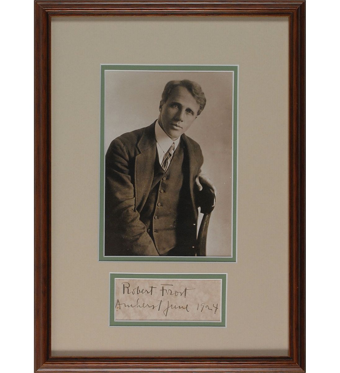 Prominent ink signature, “Robert Frost, Amherst, June 1924,” on a lightly marbled slip. Double-matted and framed with a nice portrait of Frost to an overall size of 9.5 x 13. In fine condition.