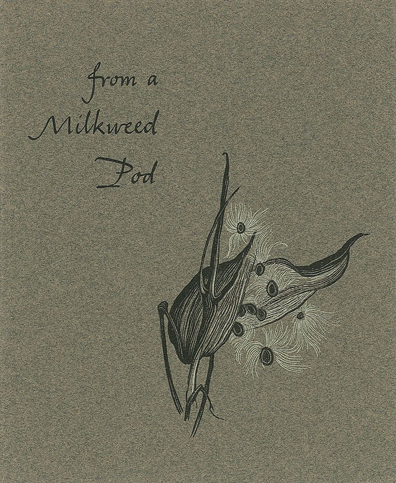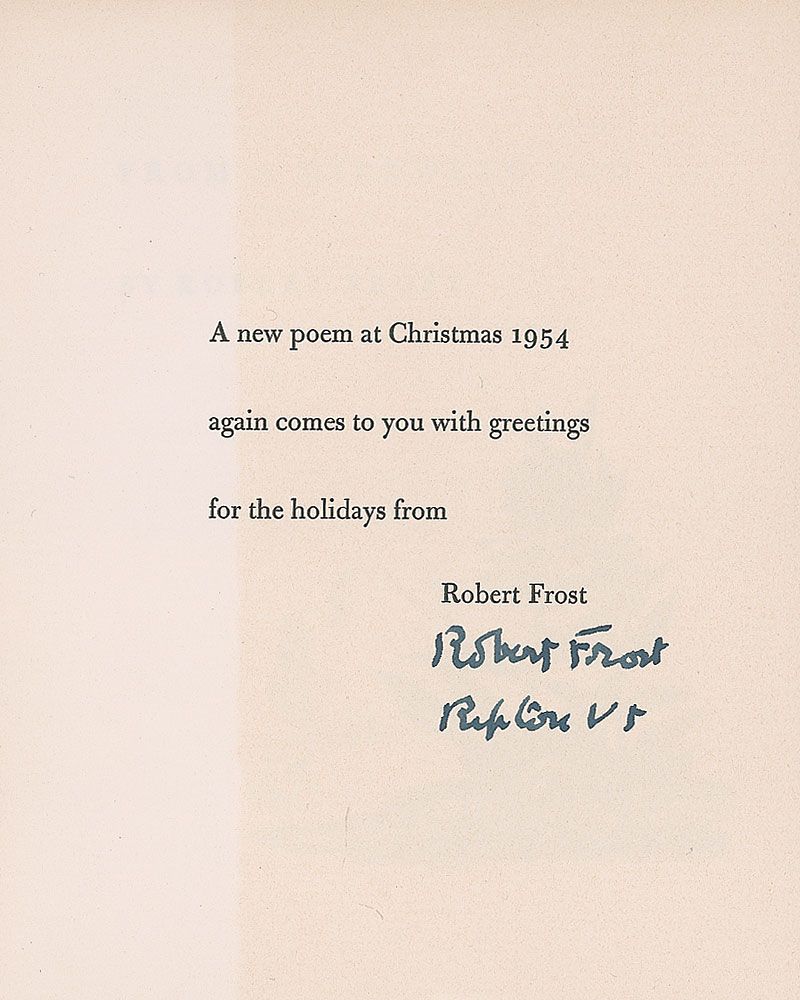 Special edition booklet of Frost’s ‘From a Milkweed Pod,’ 4.75 x 5.75, printed by Spiral Press in New York, signed on the dedication page with the printed message which reads, “A new poem at Christmas 1954 again comes to you with greetings for the holidays from Robert Frost,” and signed underneath, “Robert Frost, Ripton, Vt.” In fine condition, with some mild toning to signed page.