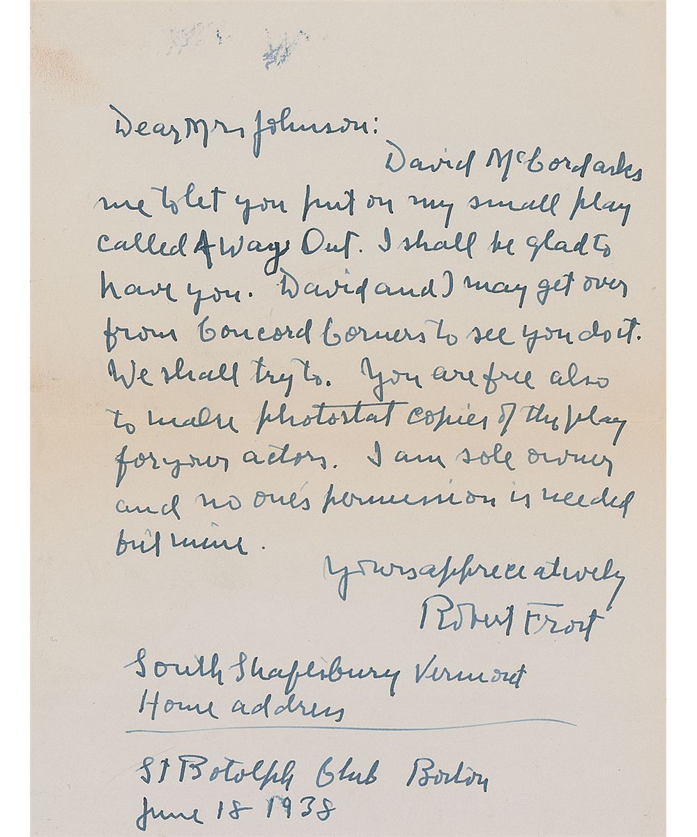Scarce ALS, one page, 6 x 8, June 18, 1938. Letter to Mr. Johnson at the St. Botolph Club in Boston. In part: “David McCord asks me to let you put on my small play called A Way Out. I shall be glad to have you. David and I may get over from Concord Corners to see you do it. We shall try to. You are free also to make photostat copies of the play for your actors. I am sole owner and no one’s permission is needed but mine.” In fine condition, with some stray ink marks and subtle stain to the top. A Way Out was Frost’s very first play, which he first published in 1917. In addition to this desirable literary content, this letter is rife with artistic associations—McCord was a fellow poet and executive at Harvard, and the St. Botolph Club was an early private arts club in Boston that counted the likes of William Dean Howells, John Singer Sargent, and Daniel Chester French among its members.